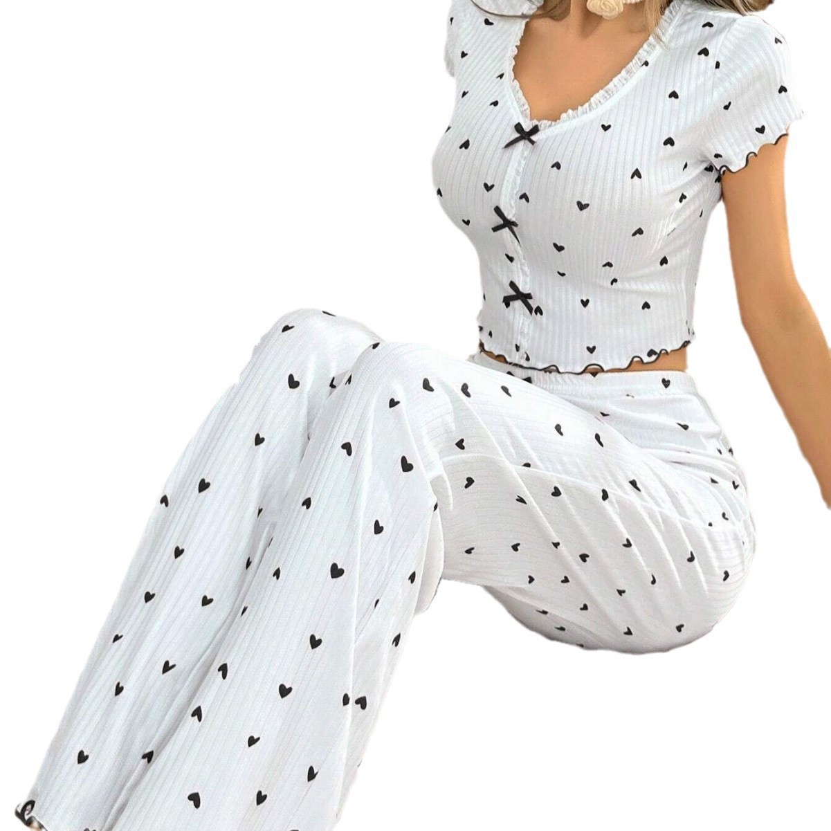 欧美跨境热销家居服印花爱心V领短袖睡衣女可外穿长裤两件 套套装