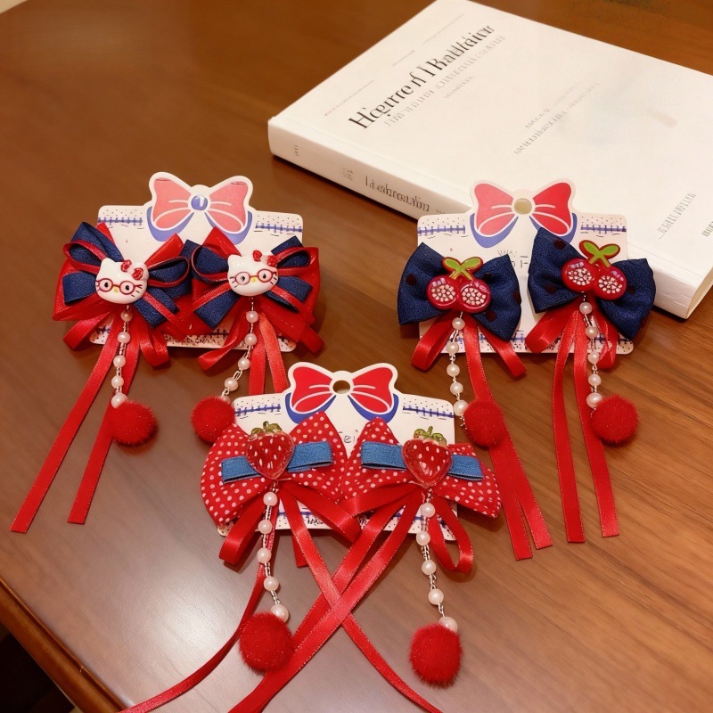 2026新年头饰儿童蝴蝶结发夹红色飘带流苏对夹女孩喜庆过年发饰