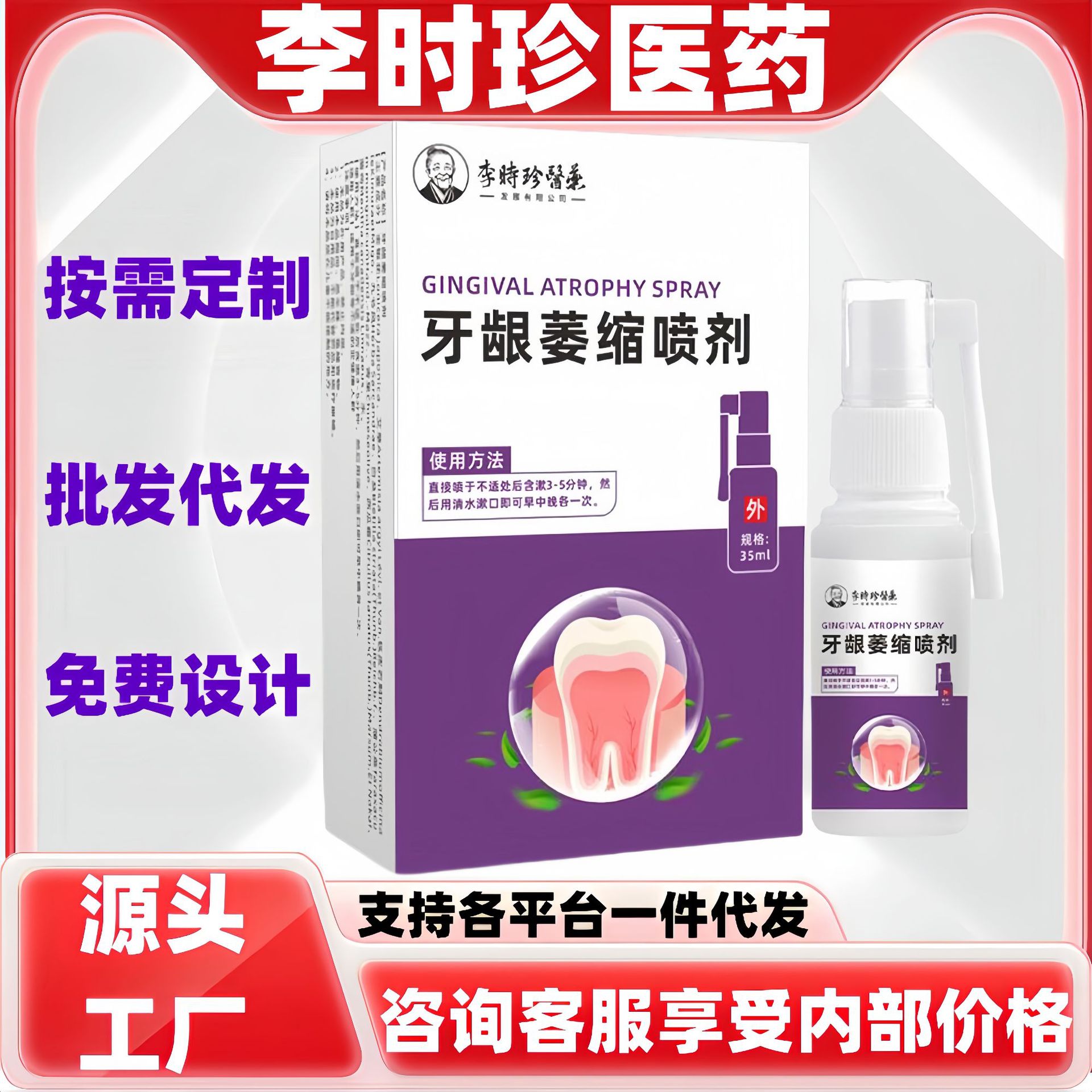 李時珍の歯茎の萎縮スプレーの現物の正規品の公式の旗艦店は代行して大量の価格の優電商の爆発金を卸売りします。