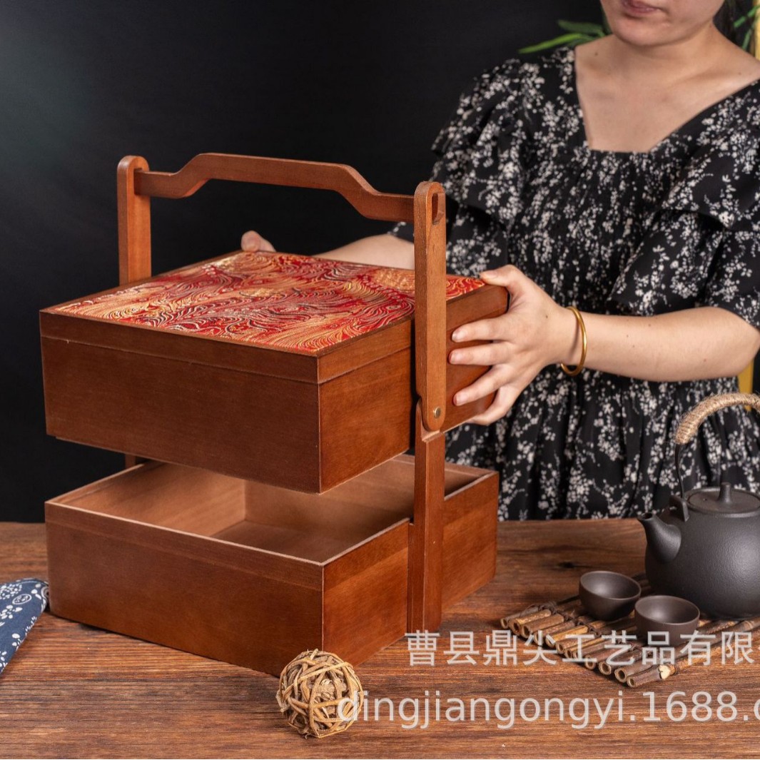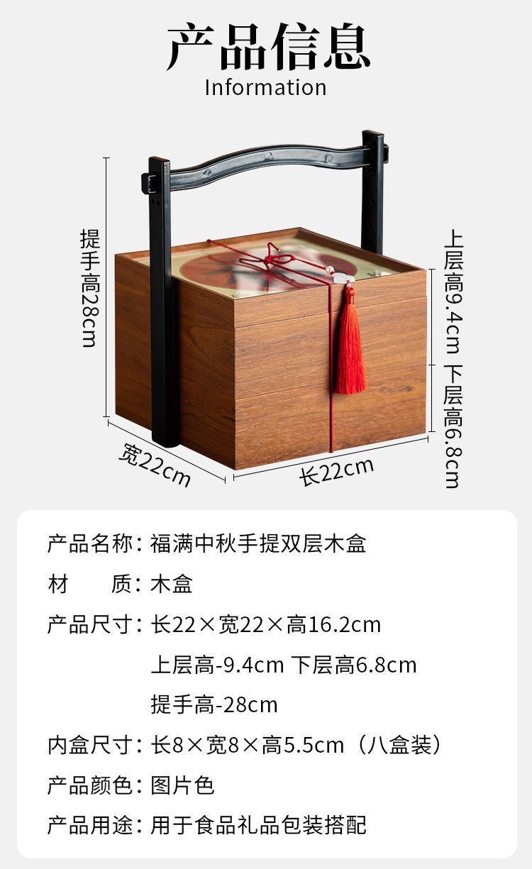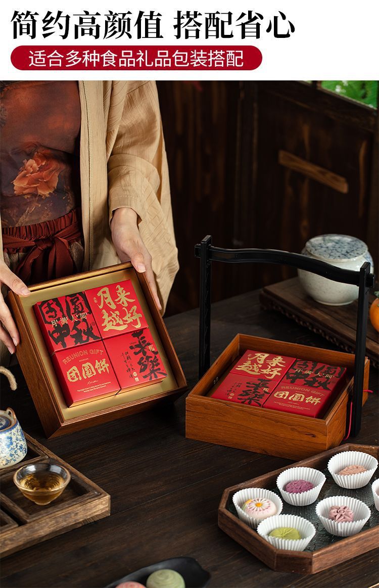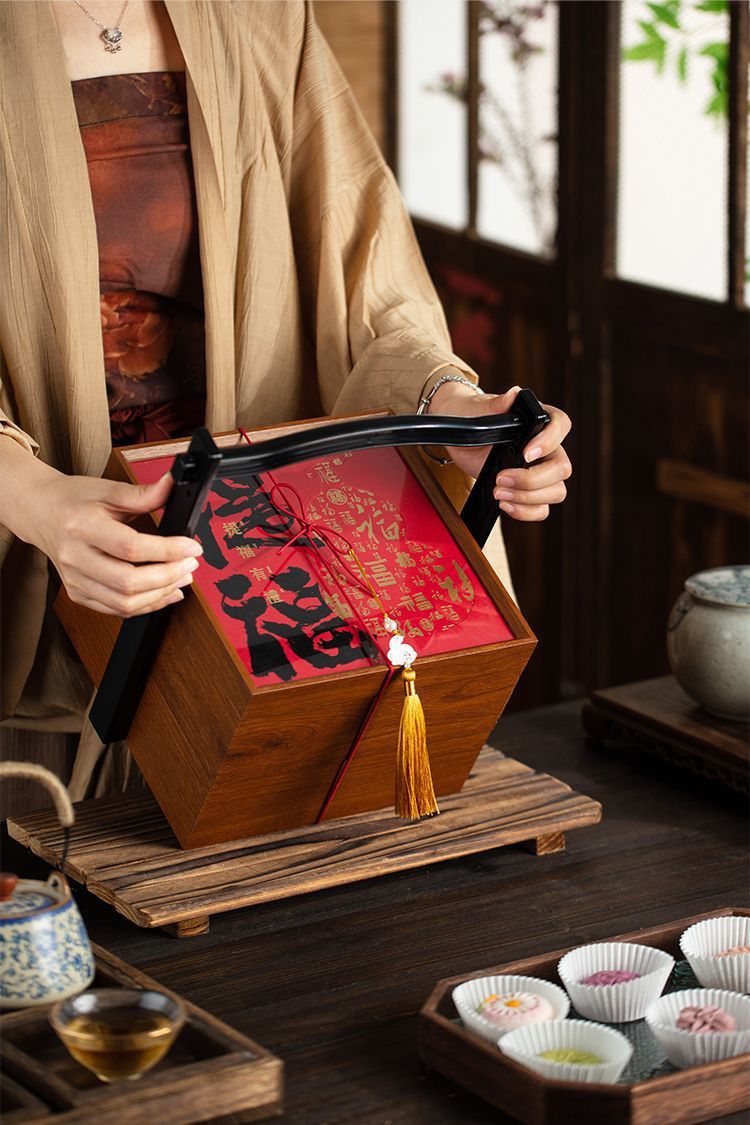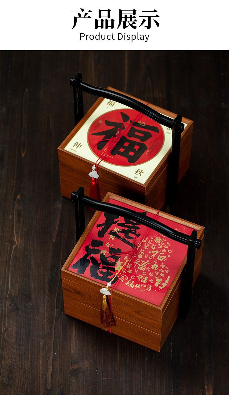 新中式红色喜庆礼品盒木质年货点心包装盒手提伴手礼双层月饼木盒