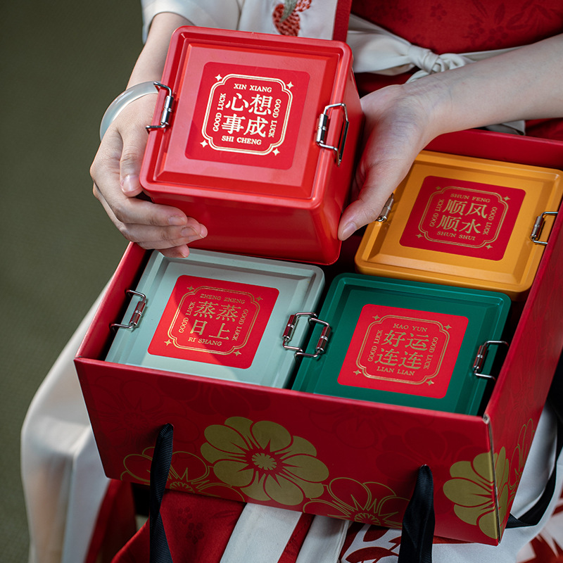 2025年式中国風ギフトボックス 誕生日記念品ギフトボックス プレゼント用 四色搭載 バックル式ブリキ缶 空箱
