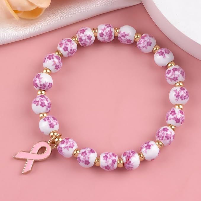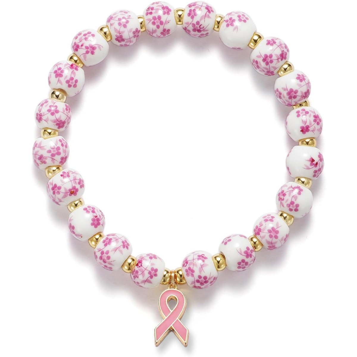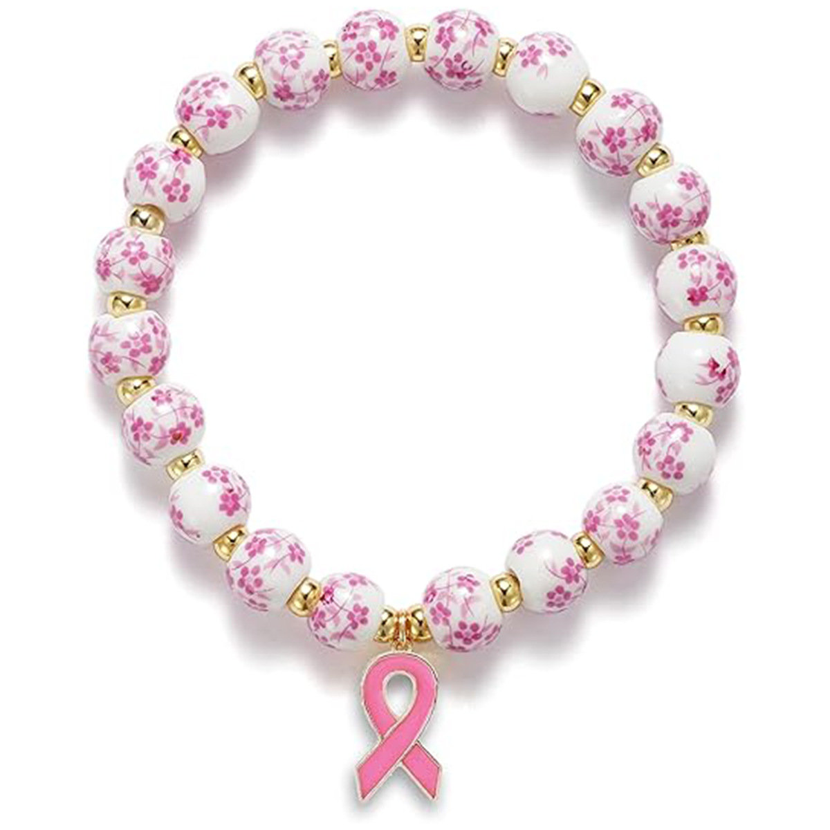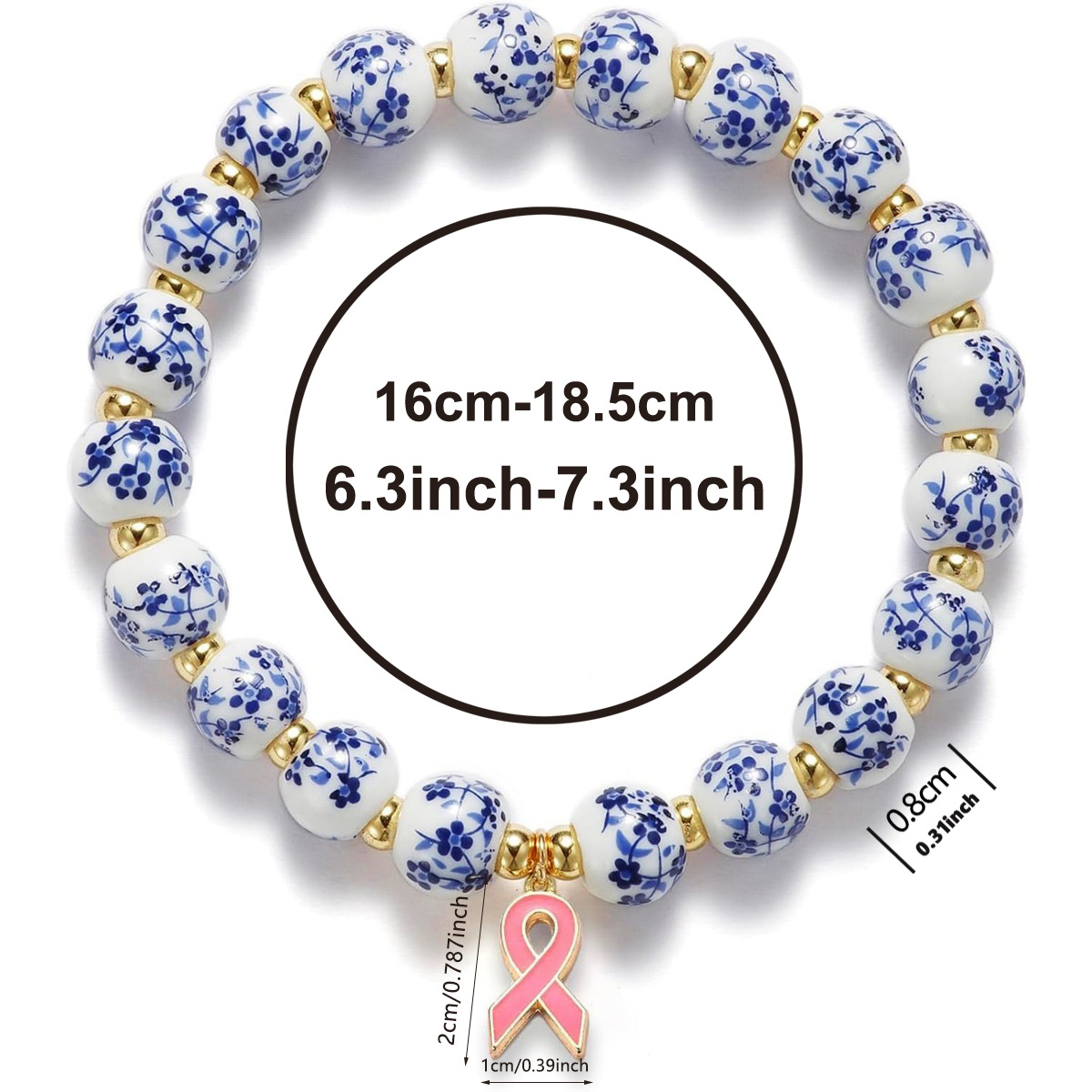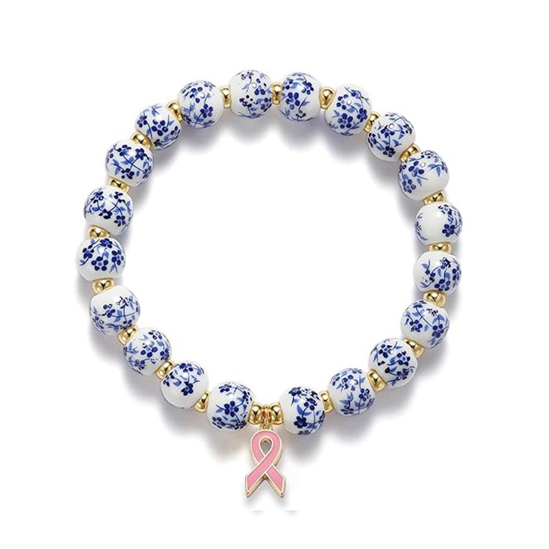 Amazon 新製品ホットスタイルレディース青と白の磁器ブレスレットピンクリボンゴールドビーズスペーサー弾性ロープギフトブレスレットブルー