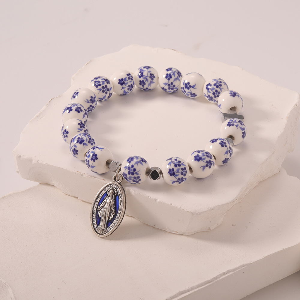 跨境外贸新款珠串 小众陶瓷青花瓷手串设计款 wwjd十字架手链串珠
