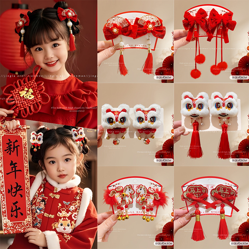 2026新年红色流苏发夹儿童拜年醒狮发卡发饰女童古风汉服夹子头饰