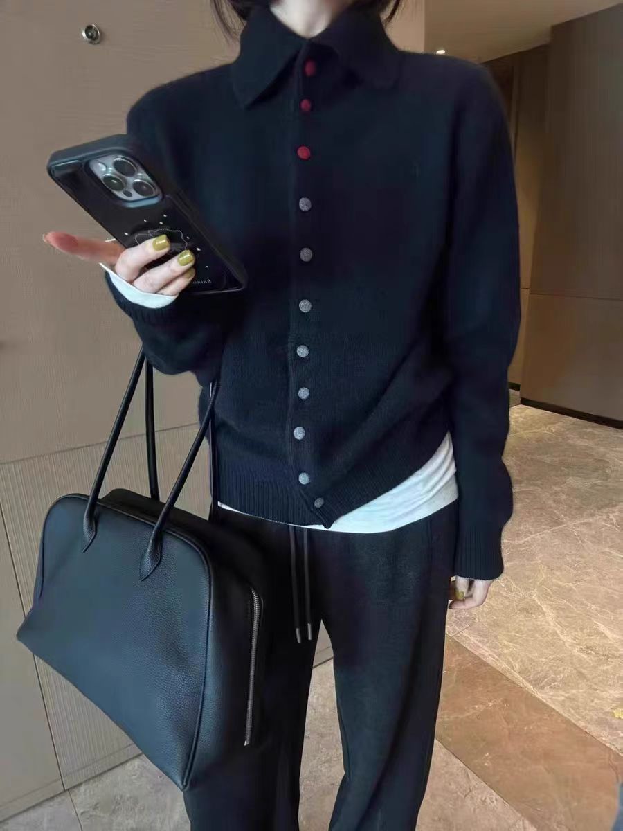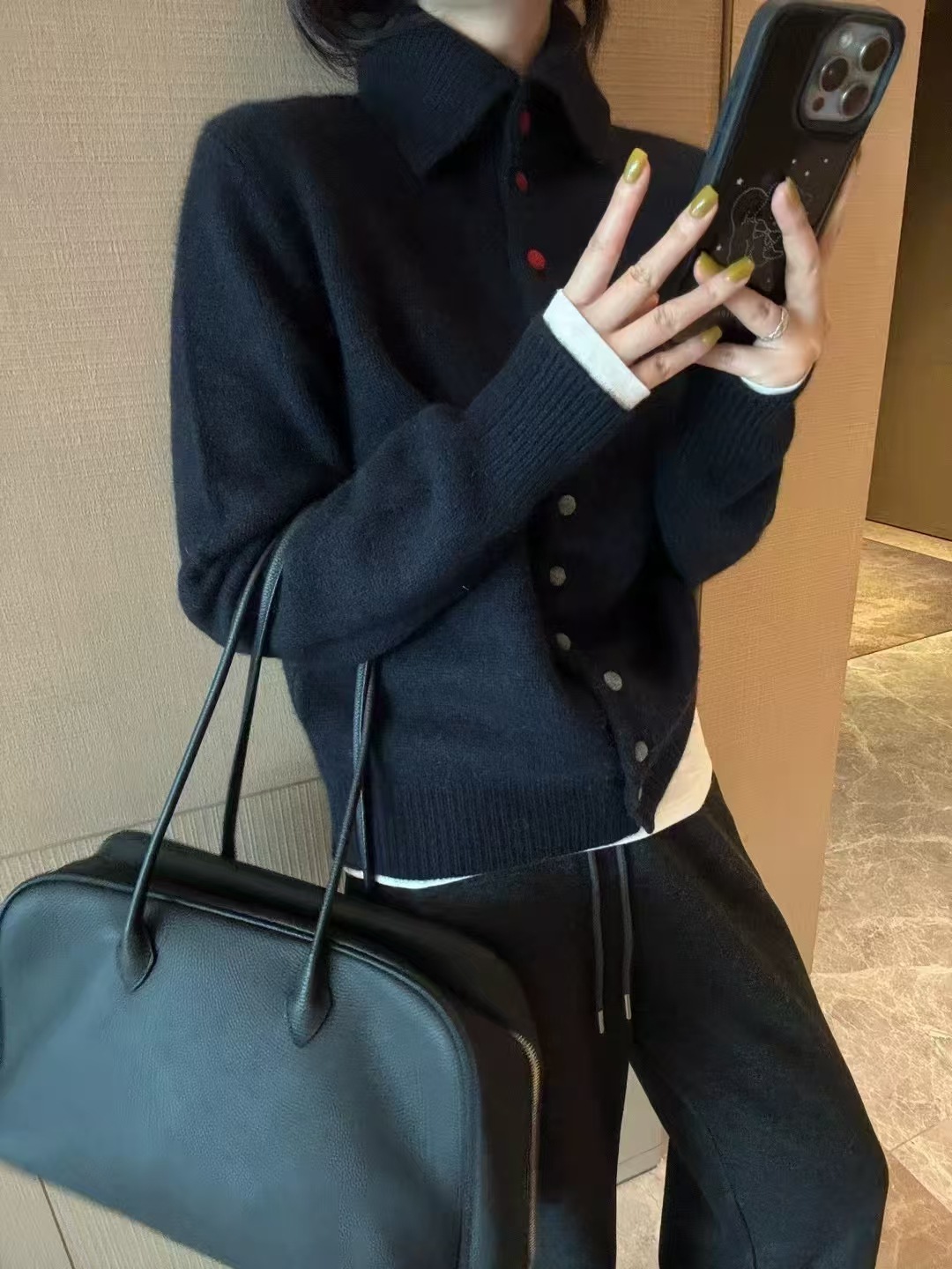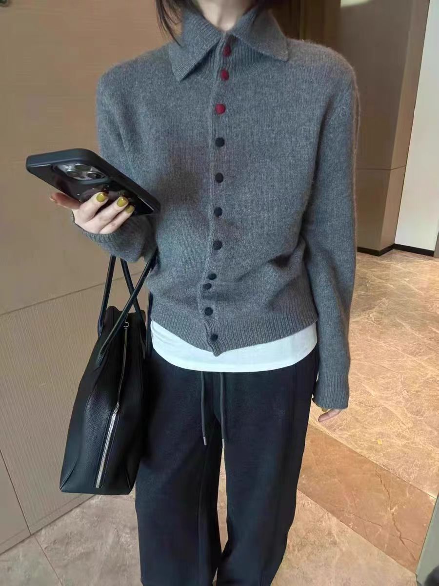 复古拼色纯羊毛针织外搭开衫女立领宽松百搭羊毛休闲毛衣外套白色