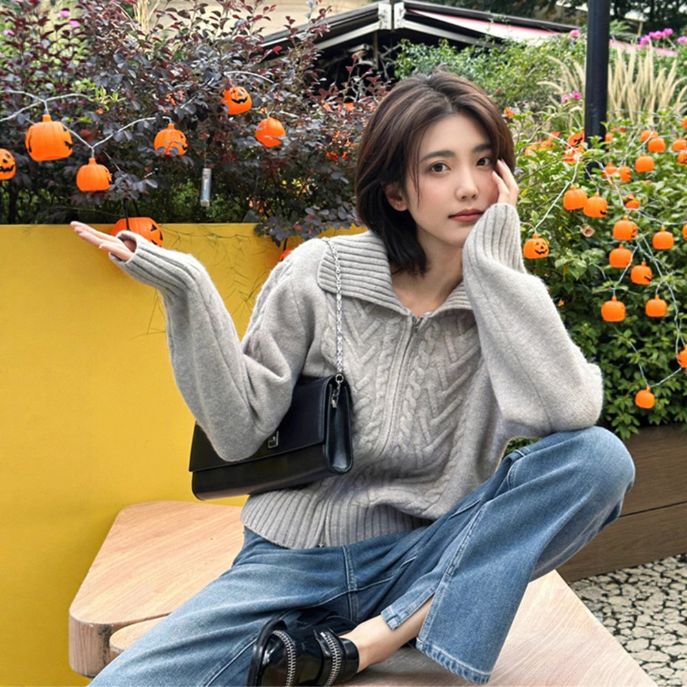 灰色麻花拉链毛衣外套女秋冬厚款慵懒风新款拉链纯羊翻领毛开衫
