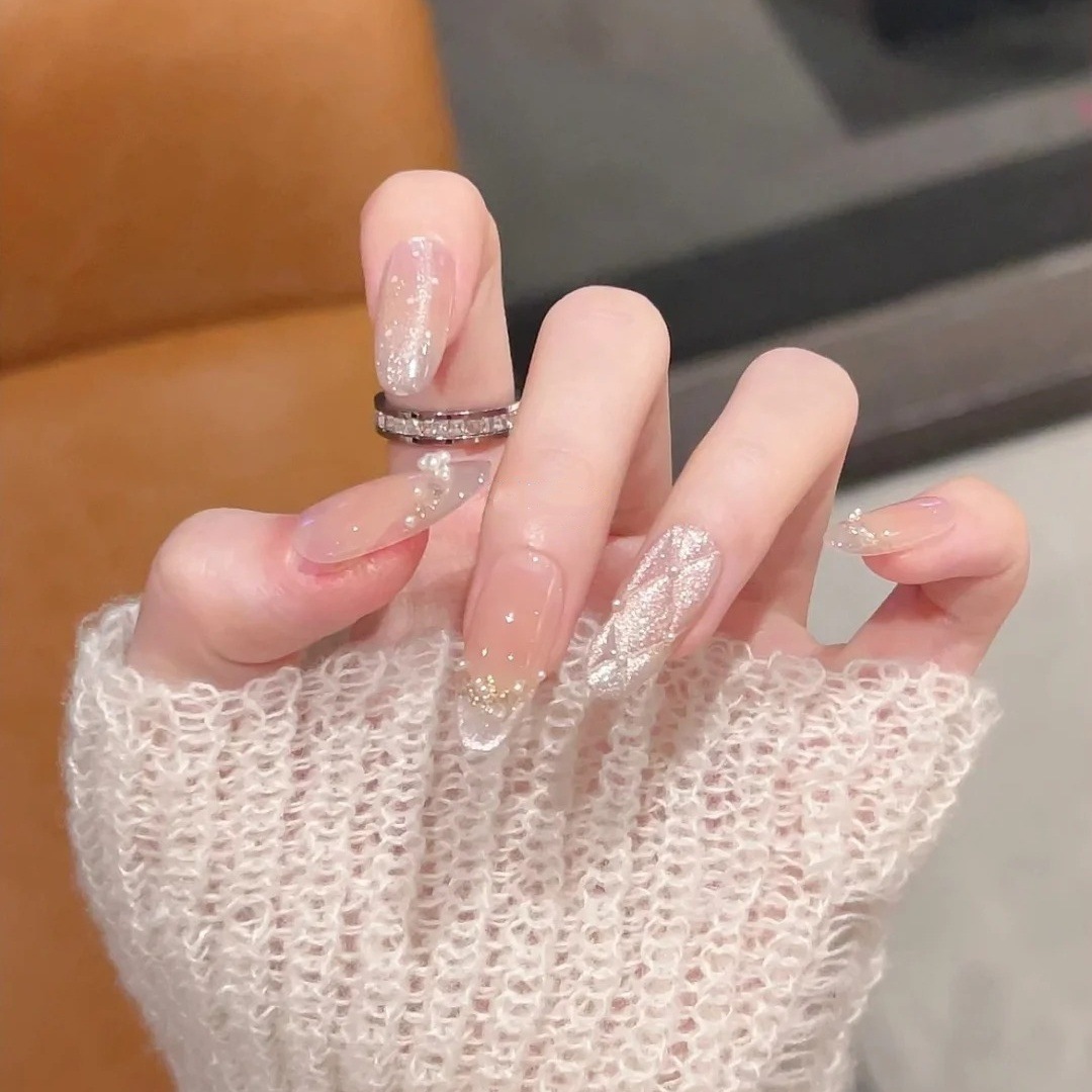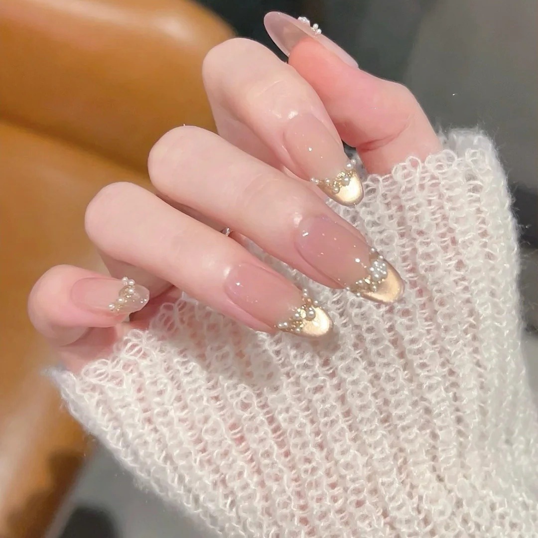 纯手工穿戴甲韩系裸粉色小清新银箔猫眼珍珠仙气轻奢温柔美甲贴片