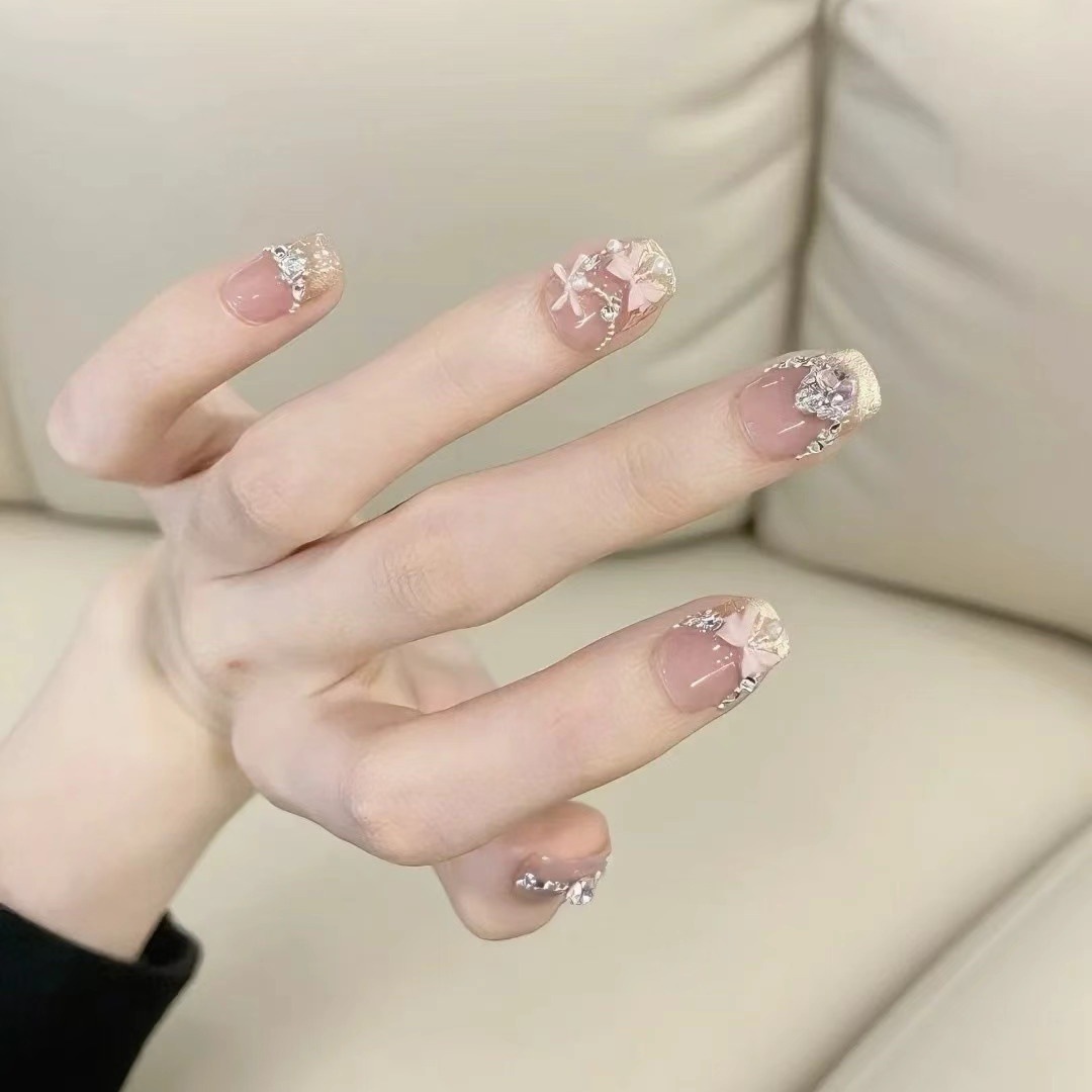 纯手工穿戴甲轻奢法式少女心甜美闪钻蝴蝶结气质显白可拆卸美甲贴