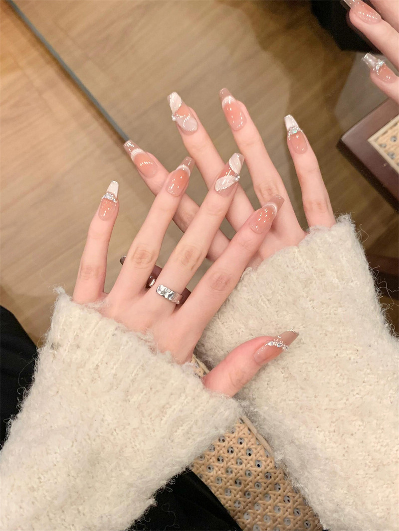 纯手工穿戴甲乳白渐变蝴蝶结闪钻高级感ins甜美公主少女心美甲贴