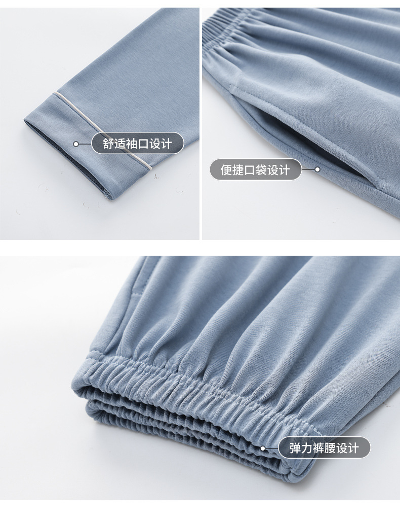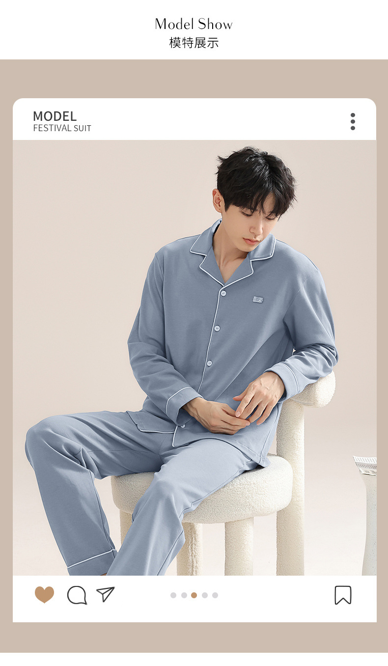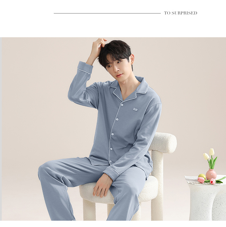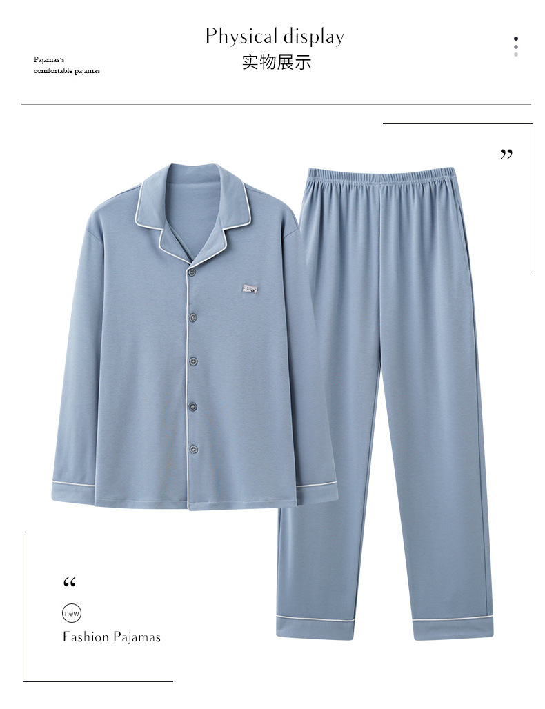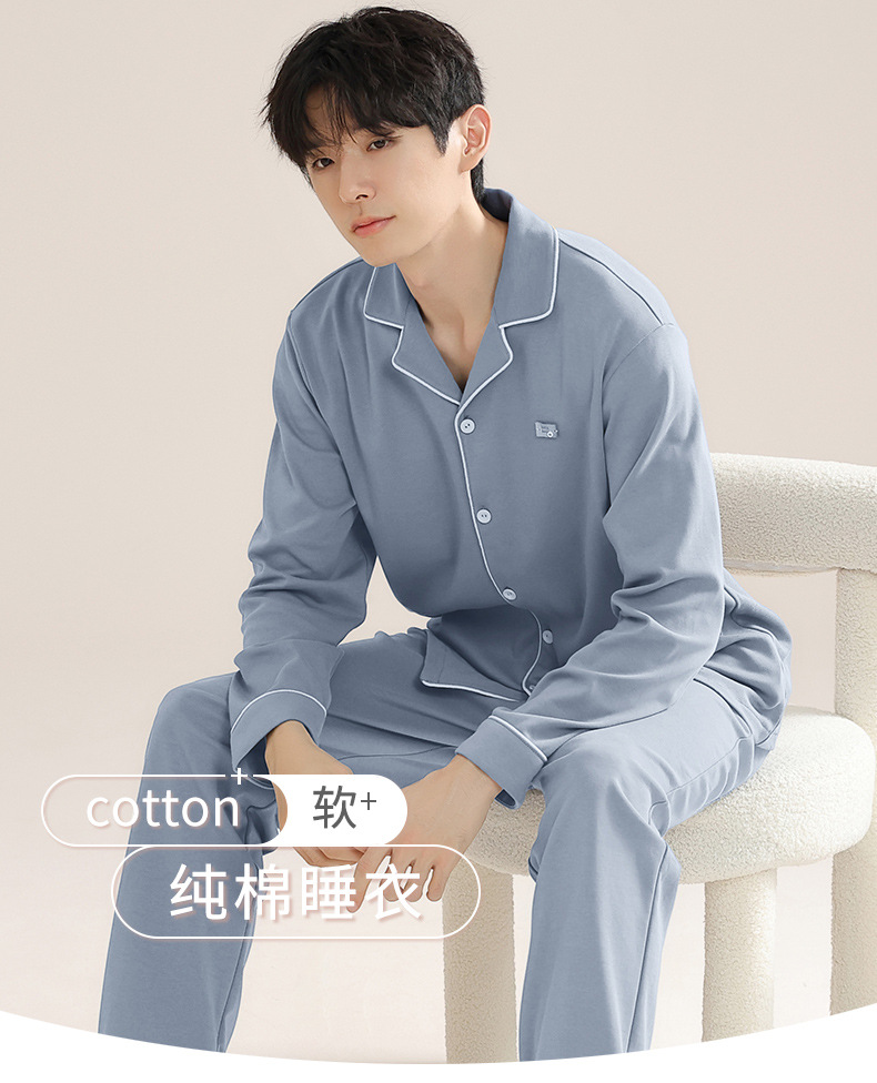 100%纯棉长袖开衫翻领睡衣男韩版新款高档全棉家居服两件套装外穿