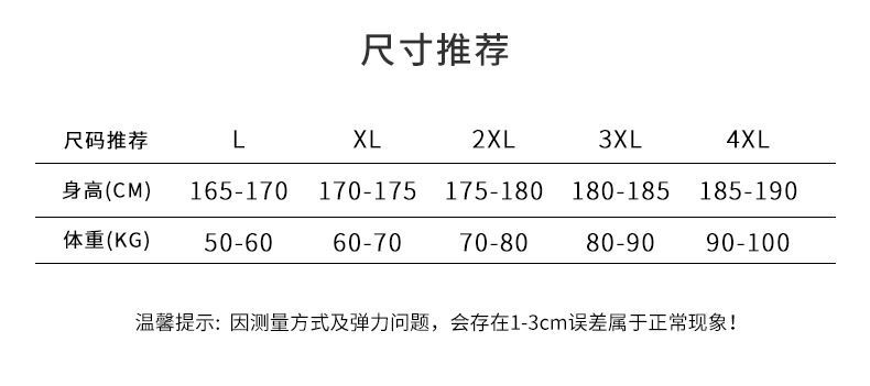 尺码 男L(建议100-130斤),男XL(建议130-150斤),男2XL(建议150-165斤),男3XL(建议165-200斤),男4XL(建议195-220斤)
