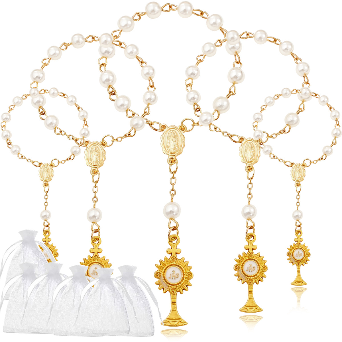 Aliexpress 新ピンクローズフラワー数珠女性ブレスレットクロスペンダントミニ洗礼パーティージュエリーギフト