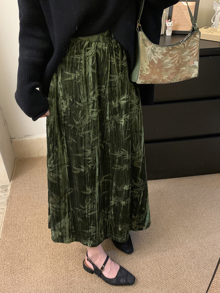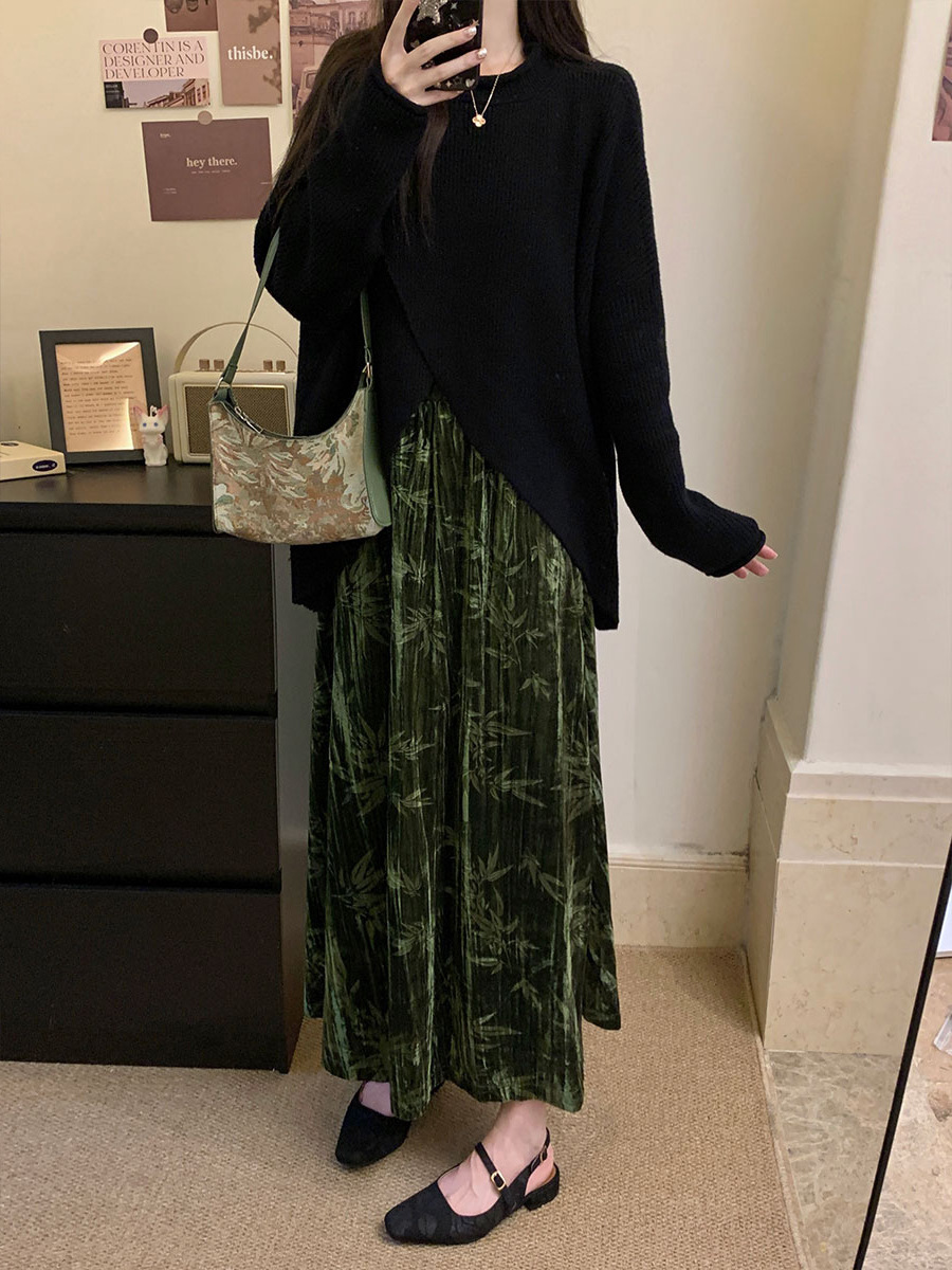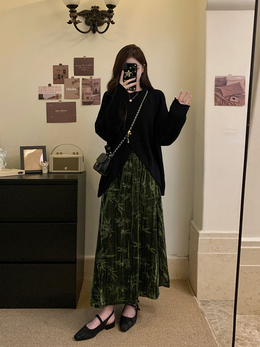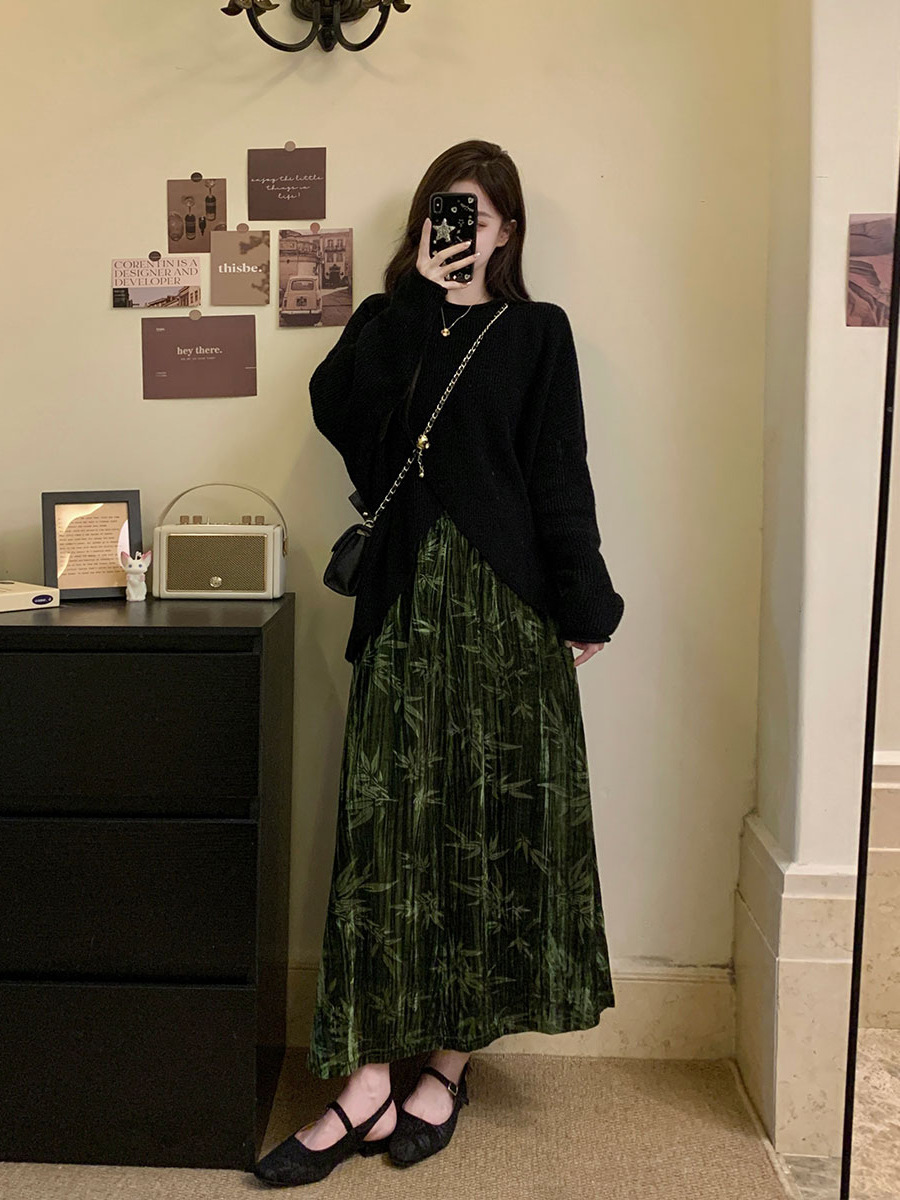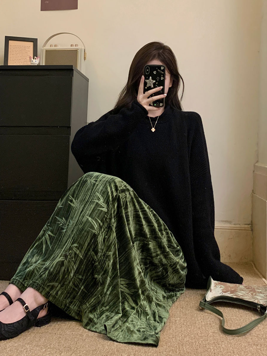 秋冬大码复古百搭设计感毛衣+半高领蕾丝打底衫+长款半身裙三件套