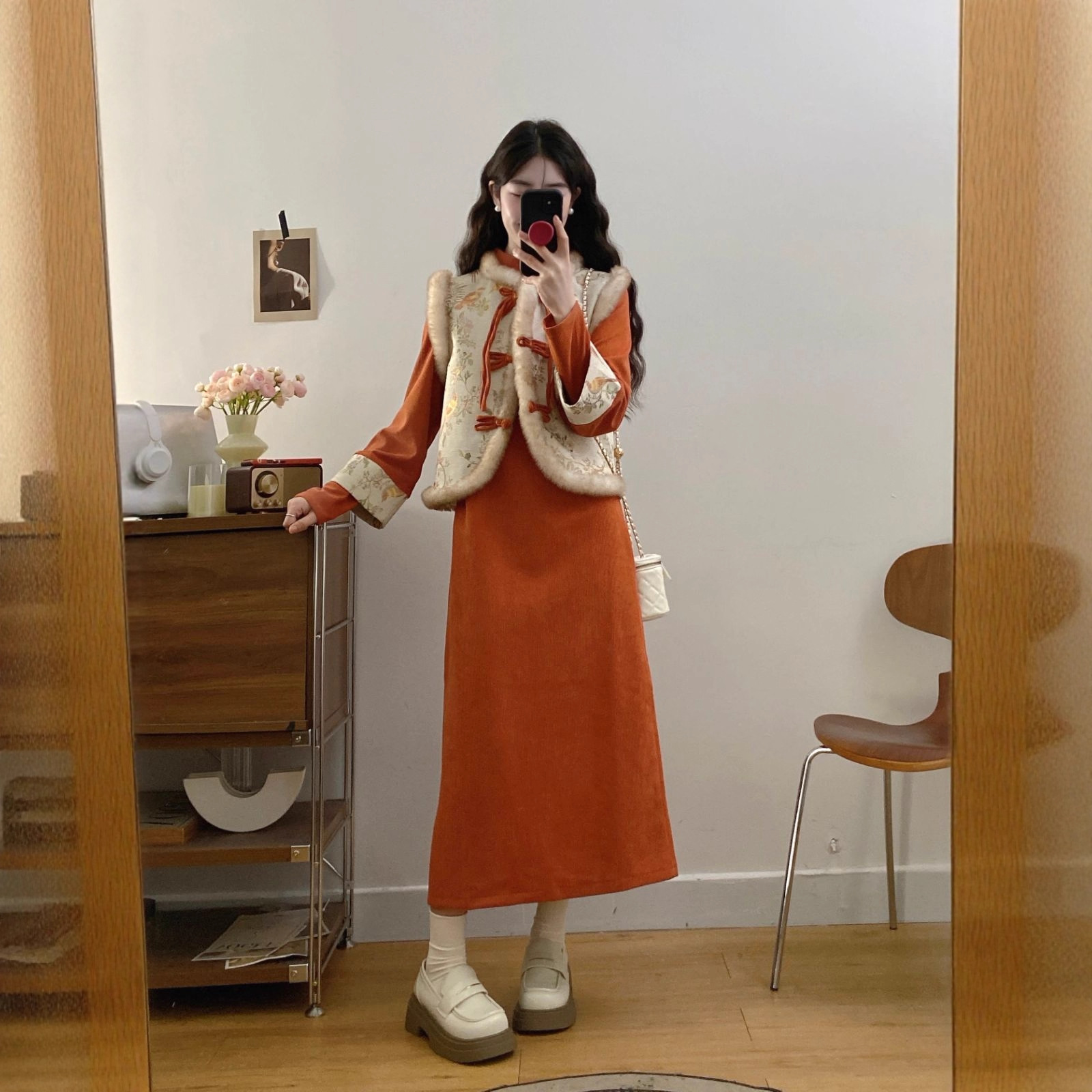 大码新中式国风套装女高端显瘦盘扣马甲气质加绒旗袍秋冬款两件套