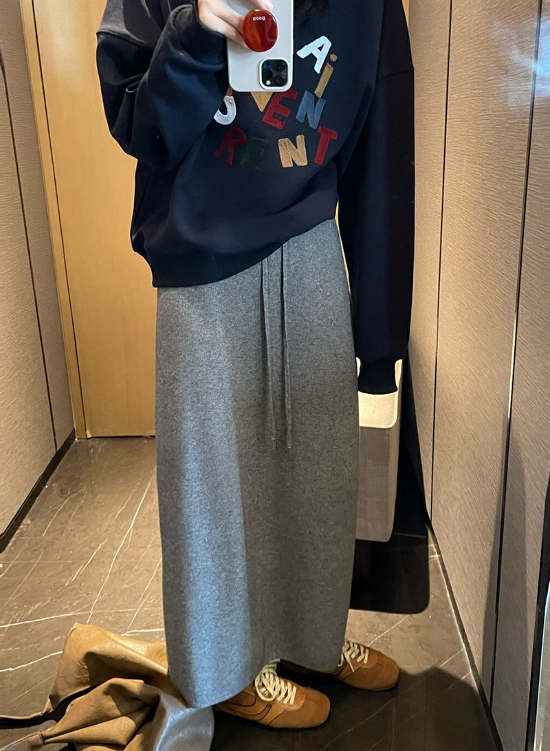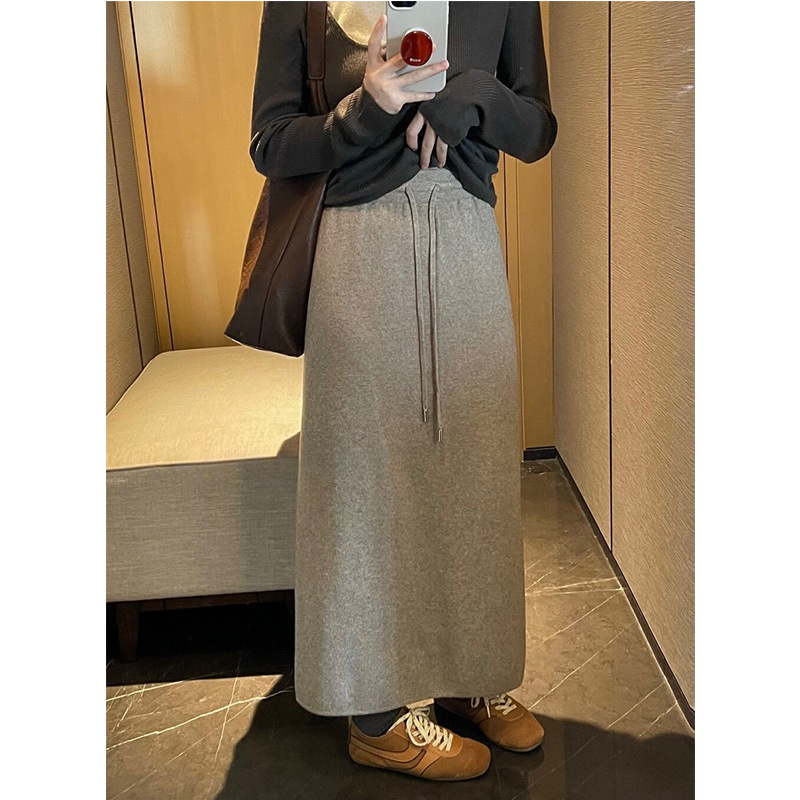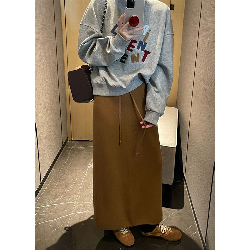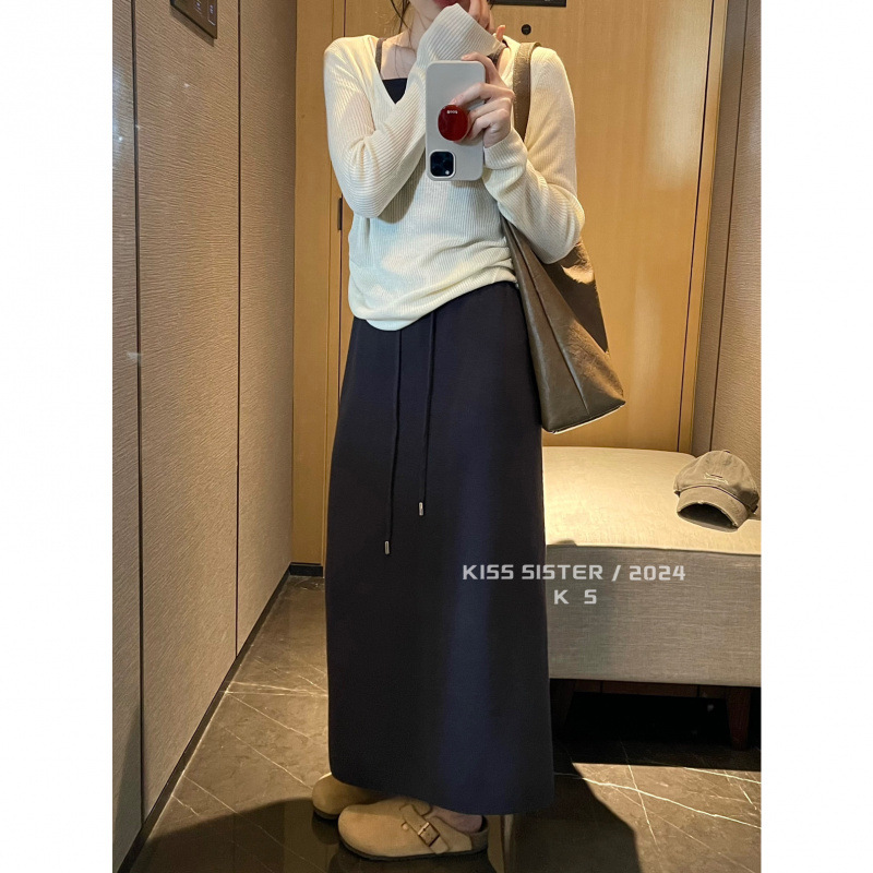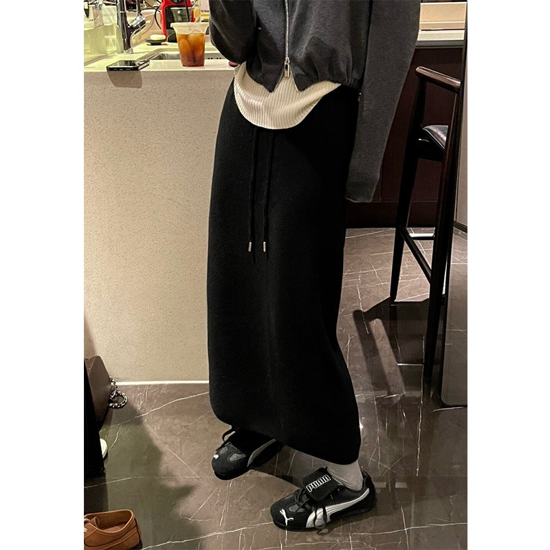 抽绳百搭直筒裙针织半身裙女秋冬新款宽松遮胯开叉长裙a字裙包裙
