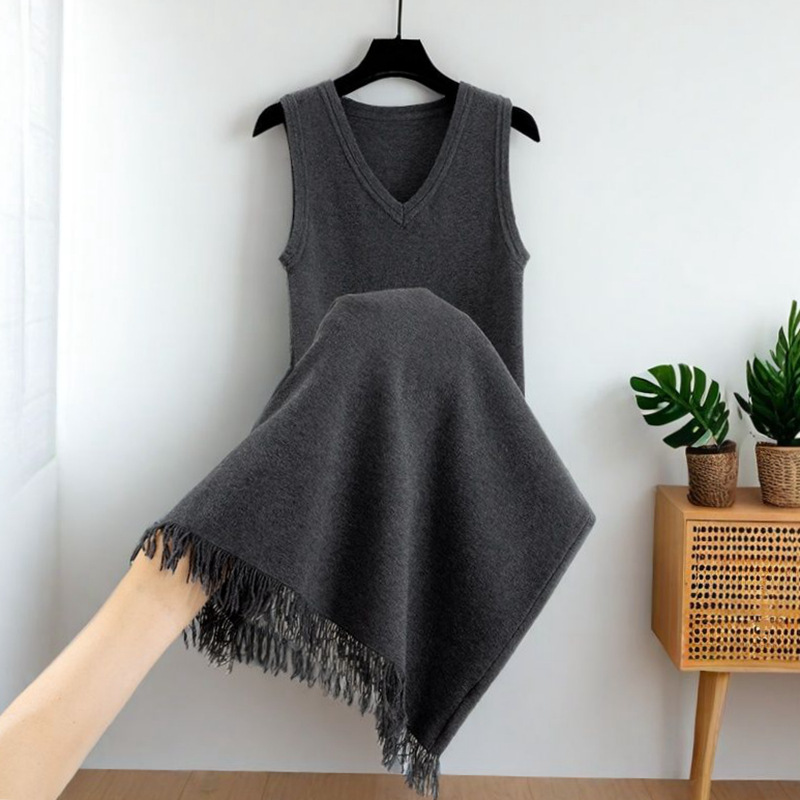 羊毛秋冬新款V领针织背心连衣裙女韩系丝巾宽松显瘦内搭打底长裙