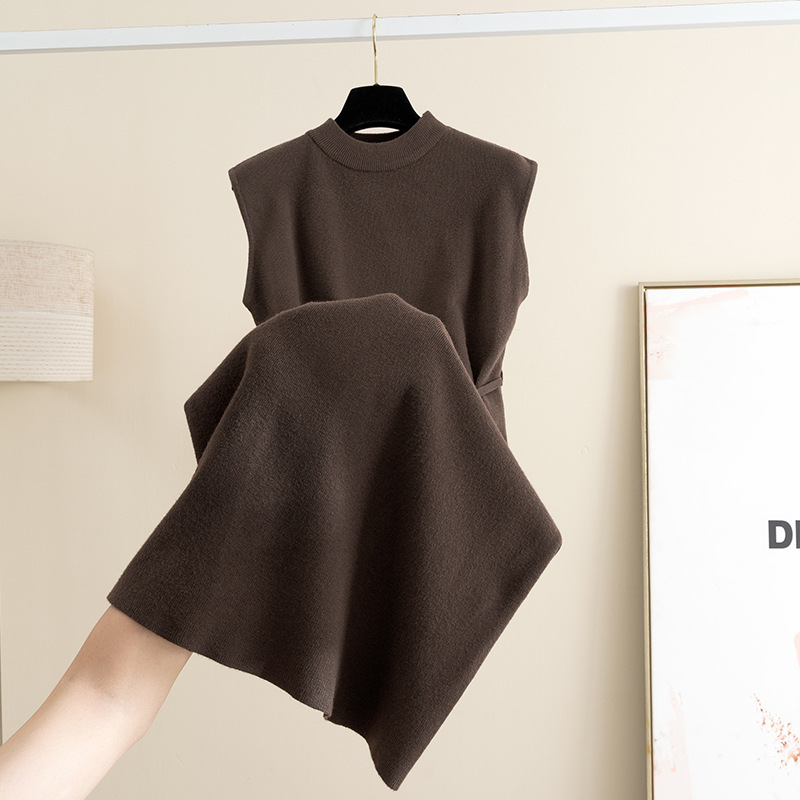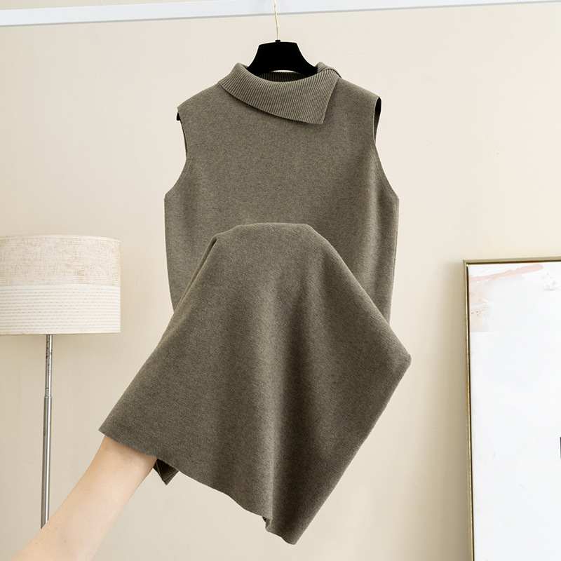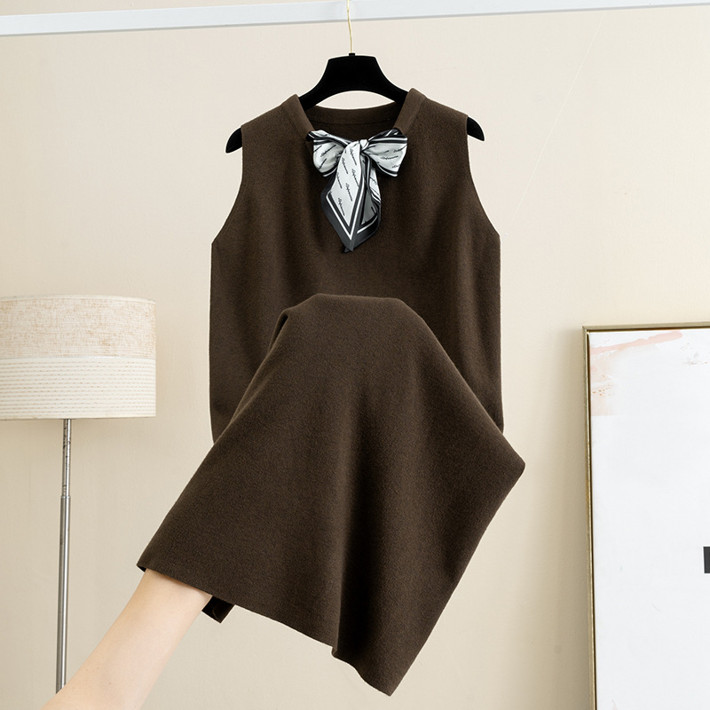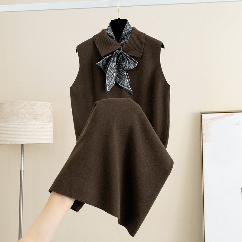 羊毛翻领配丝巾针织背心连衣裙女秋冬新款宽松显瘦外穿内搭毛衣裙