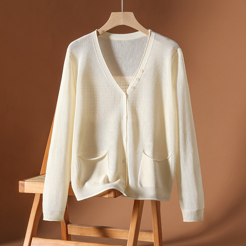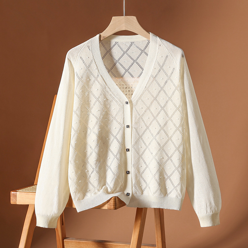 春夏の新型vネックの氷糸のニットのカーディガンの女性のゆったりしている大きいサイズは長袖の日焼け止めのシャツにスカートのエアコンのシャツを配合します。