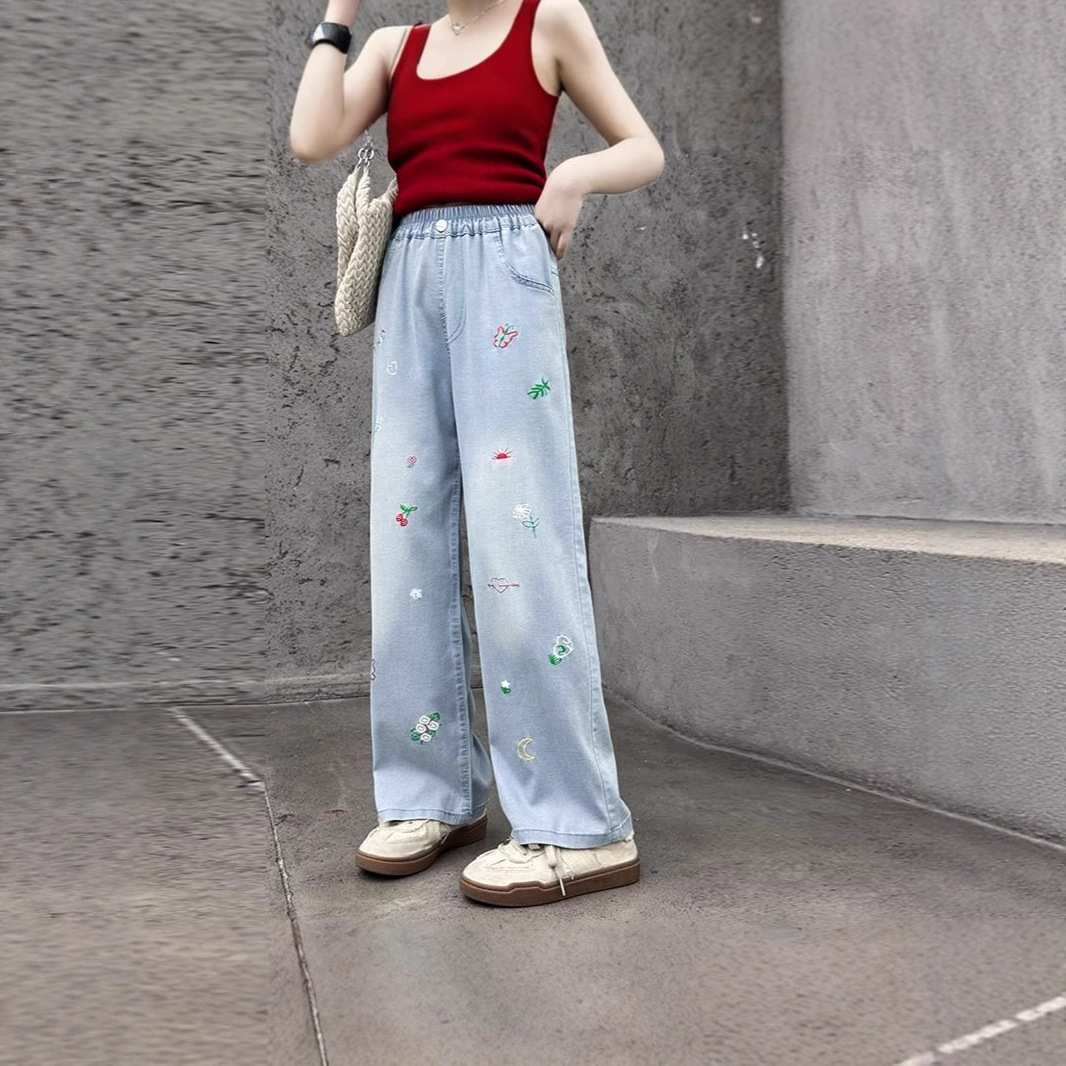 女の子のジーンズ2025の新しい子供の夏の薄いタイプの氷のズボンの大きい子供の流行の広い足のズボンの夏服