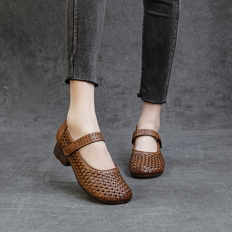 第一層牛革春夏新作ベルクロストラップ手織りレトロカジュアルシューズレトロミッドヒール婦人靴