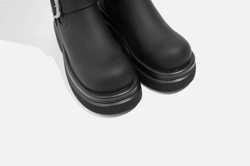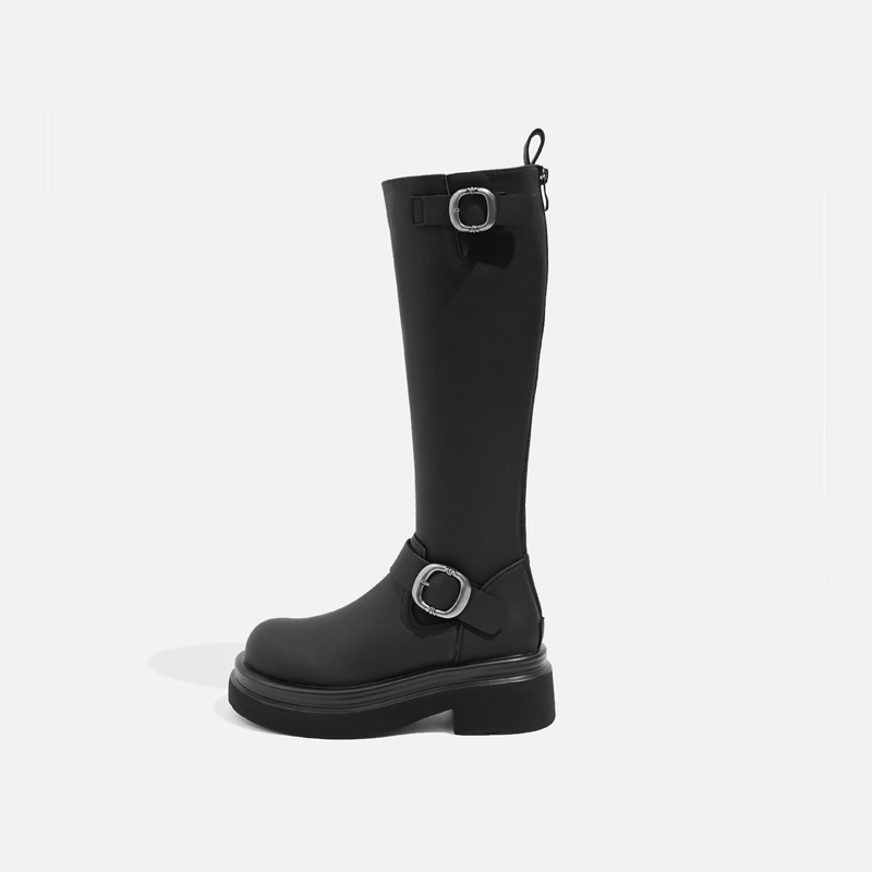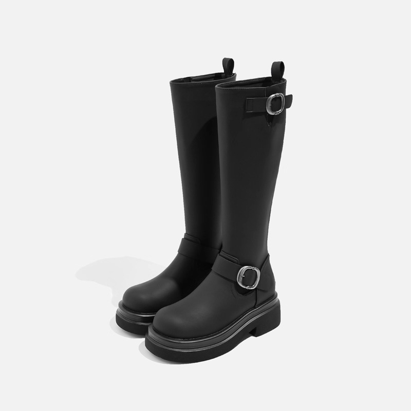 ベルトバックル付き膝丈ブーツ レディース 2025秋冬 ラウンドトゥ 多用途 厚底 身長アップ ブラック ハイブーツ ライダーブーツ