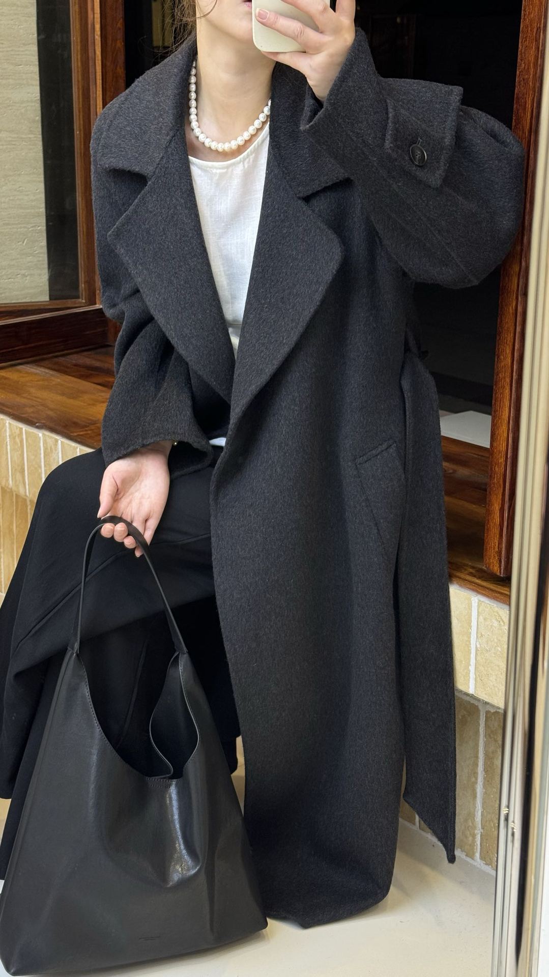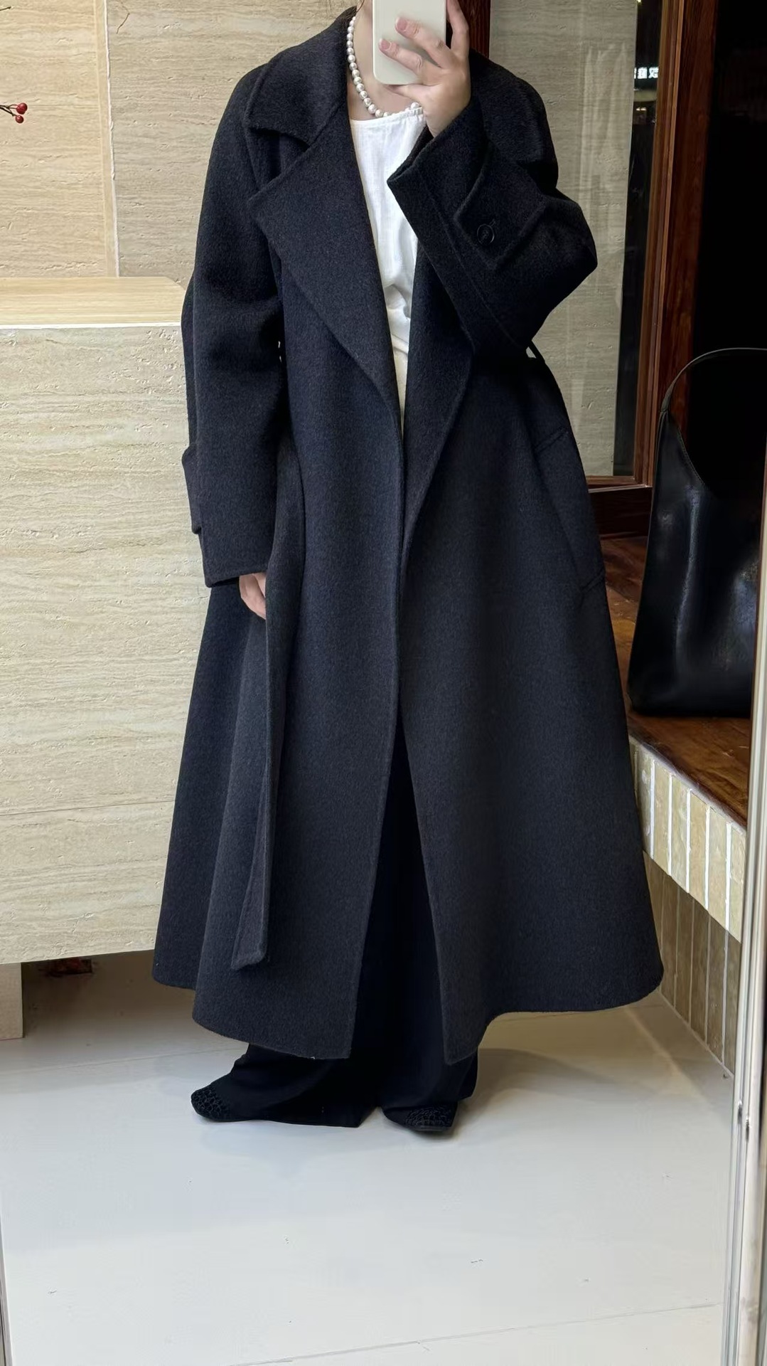 バスローブ式の大きな襟は両面のウールコートを着ています。