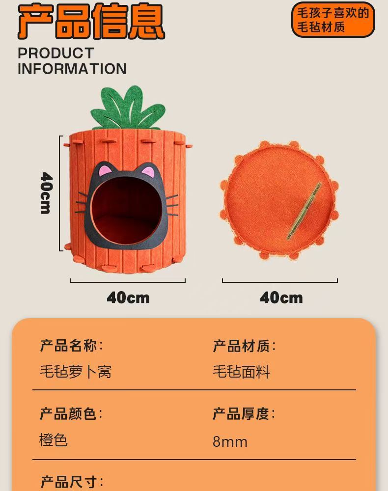 毛毡胡萝卜猫窝四季通用半封闭式保暖舒适耐磨可拆洗拆卸