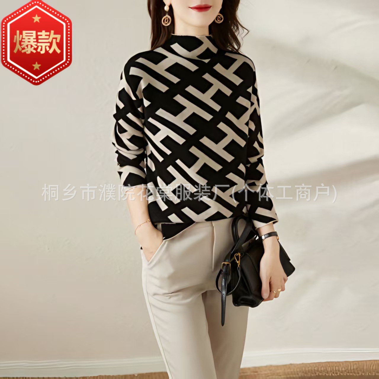 カシミヤセーター レディース ハーフタートルネック ボトリング セーター スリムフィット ニット インナートップ プリント 長袖