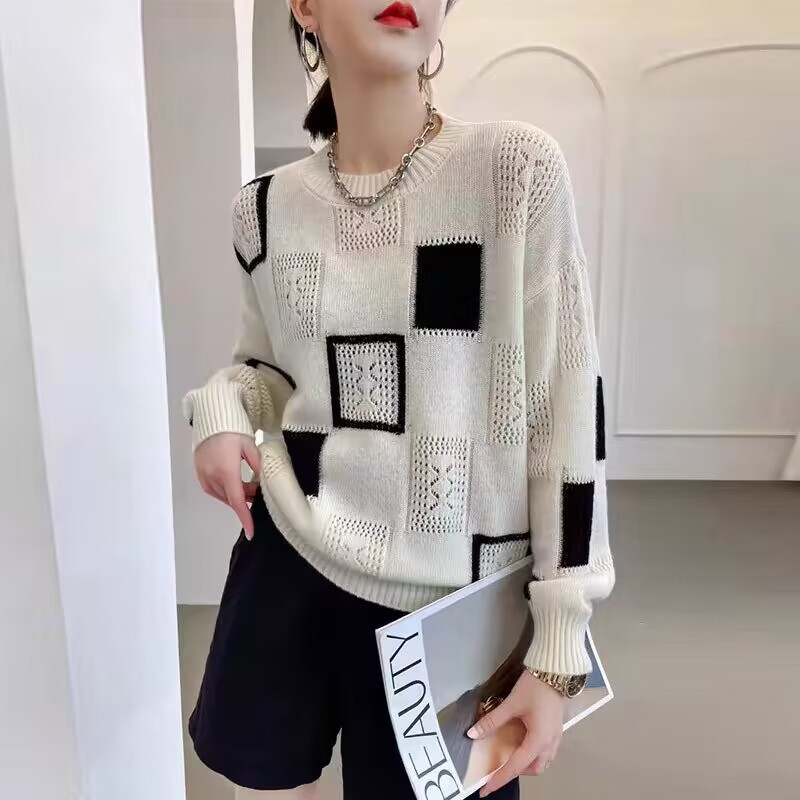 跨境黑白撞色小方格针织衫 秋冬季韩版显瘦休闲宽松百搭镂空长袖