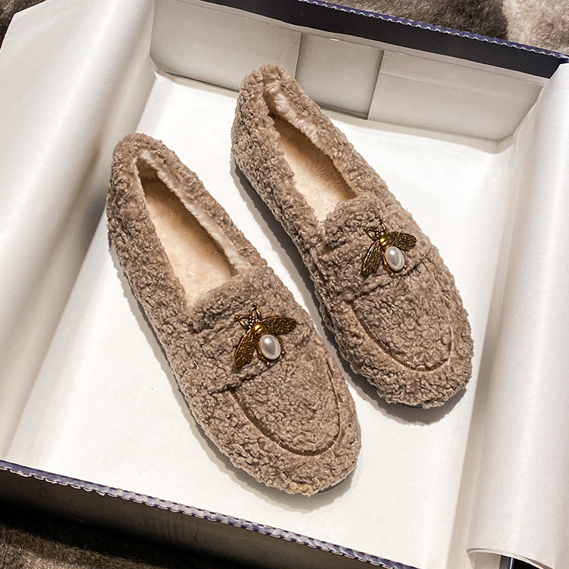 羊毛の毛皮靴、女性用冬用外履き2025韓国版平底保温スリッポン、妊婦用豆豆シューズ、おしゃれで快適、滑り止め