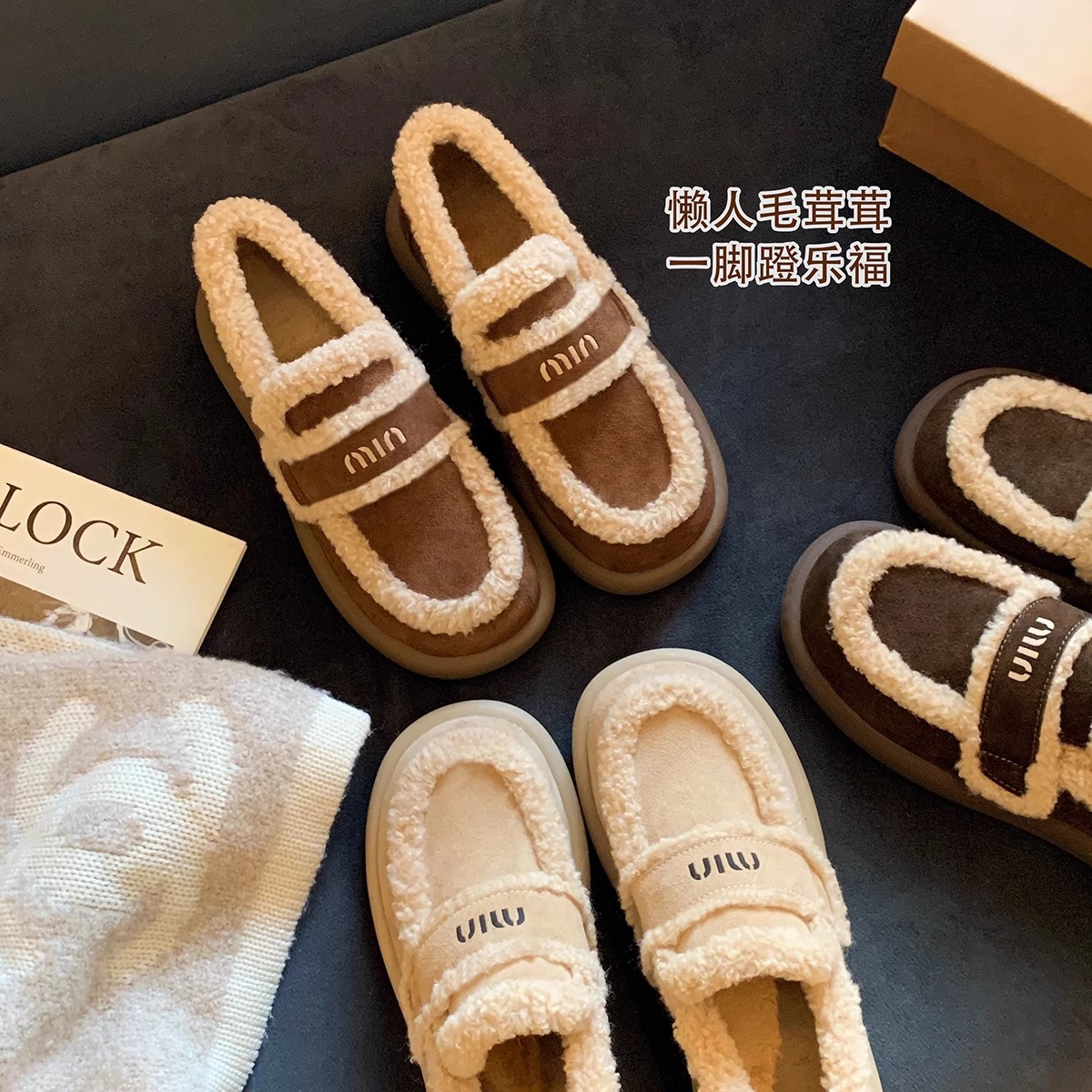 加绒豆豆鞋女冬2025新款厚底毛毛鞋外穿平底一脚蹬棉鞋大码女鞋子