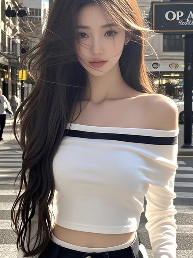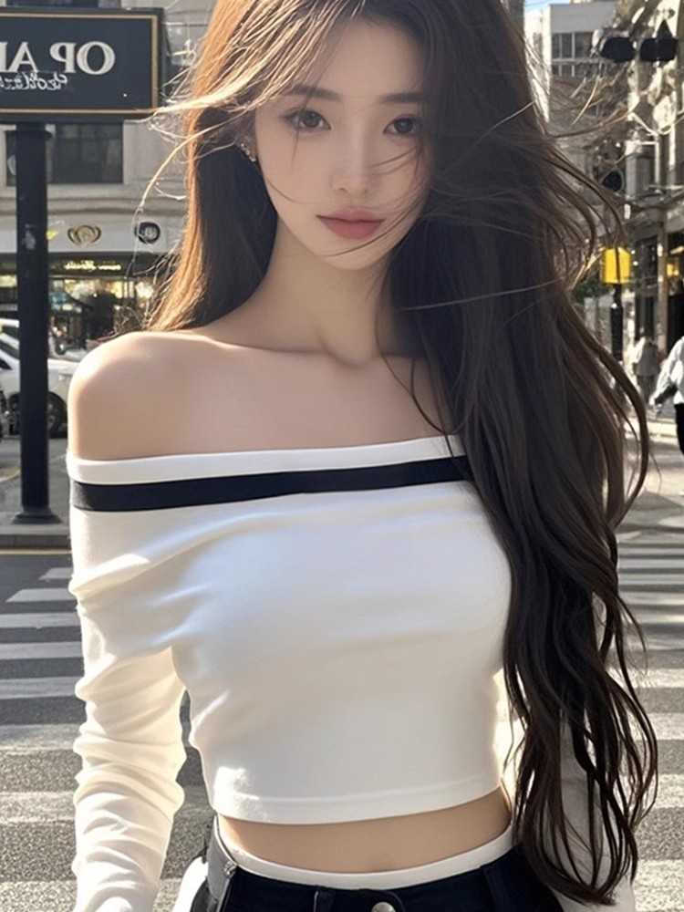独特别致白色甜辣妹一字肩打底衫女设计感小众修身超好看露脐上衣