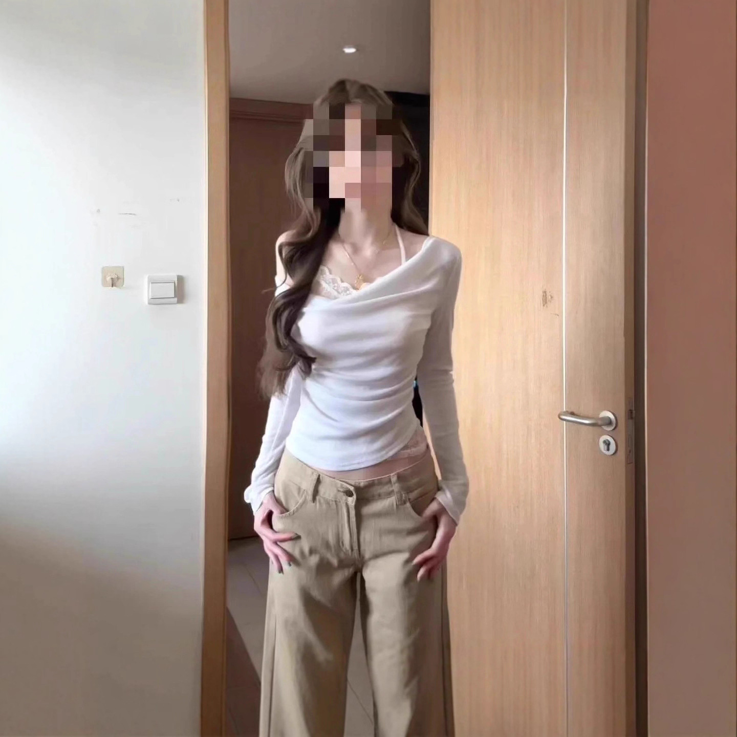 假两件斜肩荡领长袖T恤女2025早秋新款修身显瘦蕾丝挂脖露肩上衣