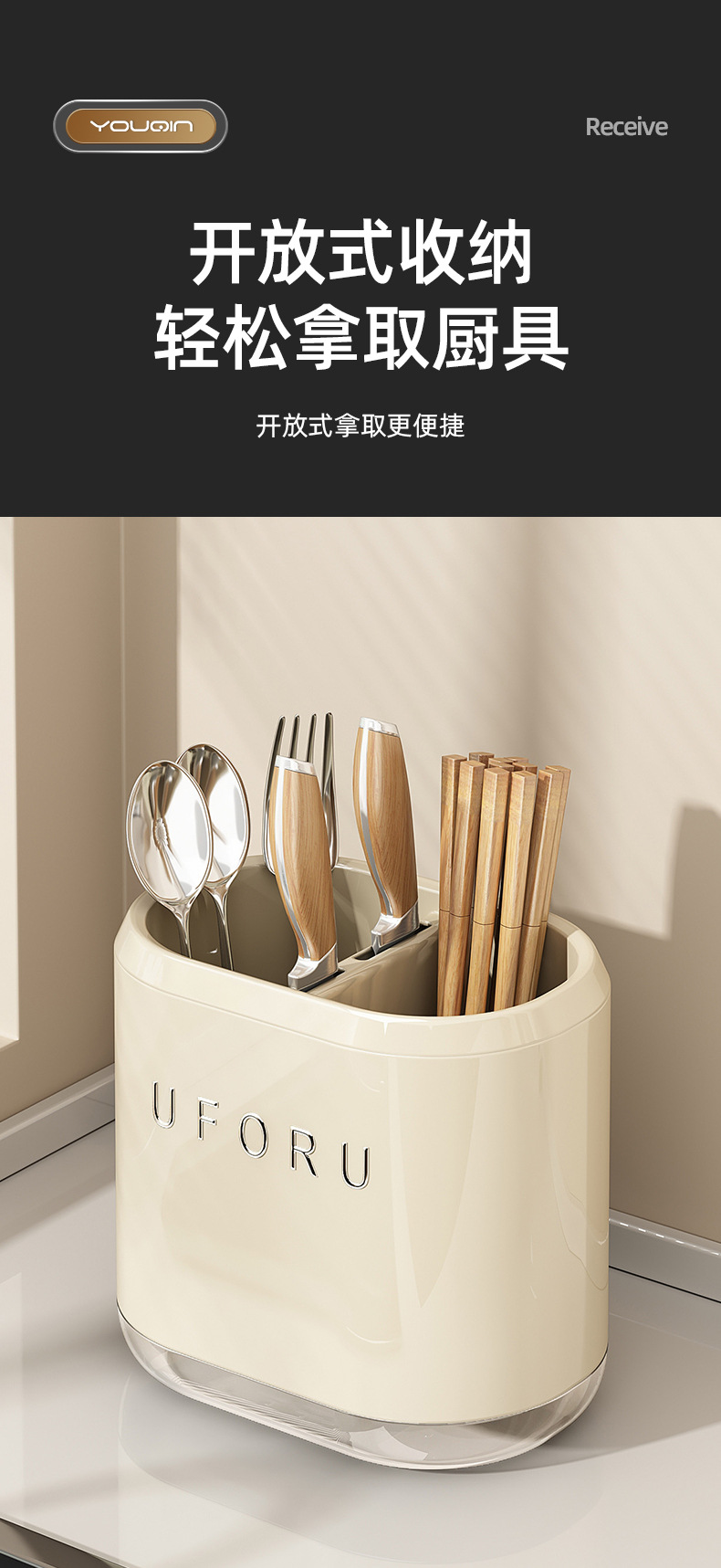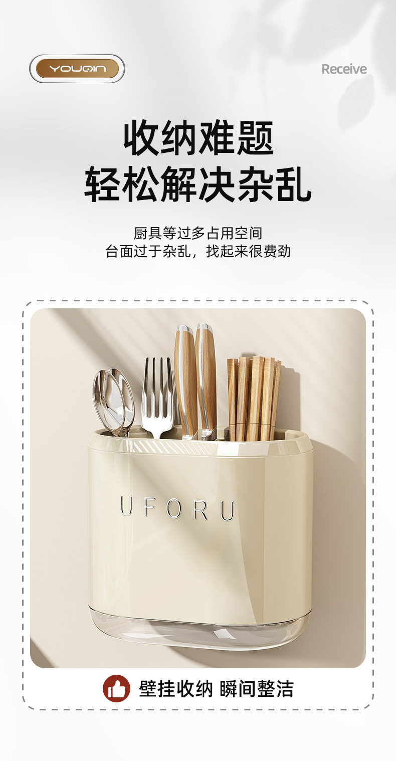 厨房刀具收纳架台面沥水奶白色单双杯菜刀餐具免打孔一体架筷子筒