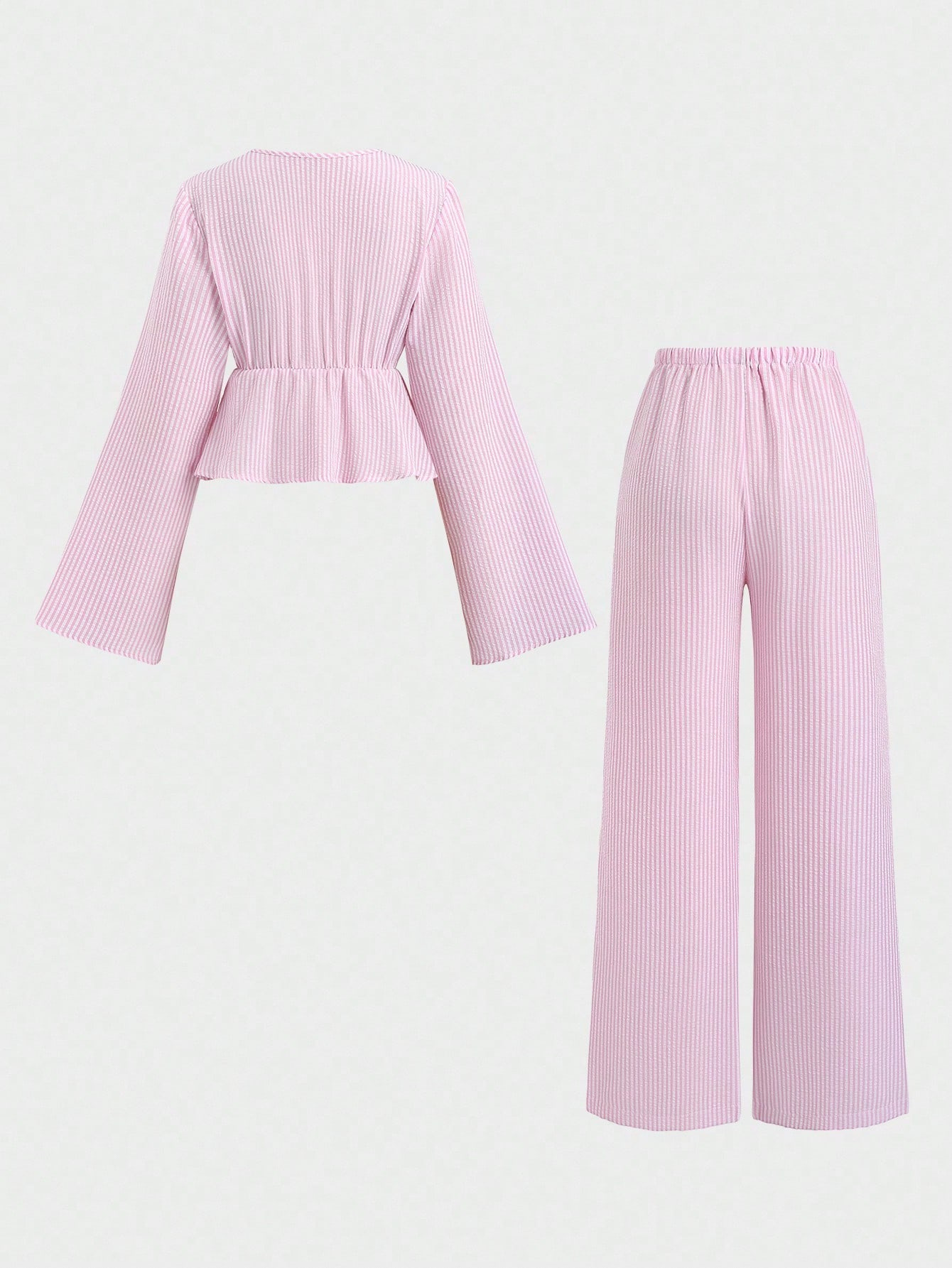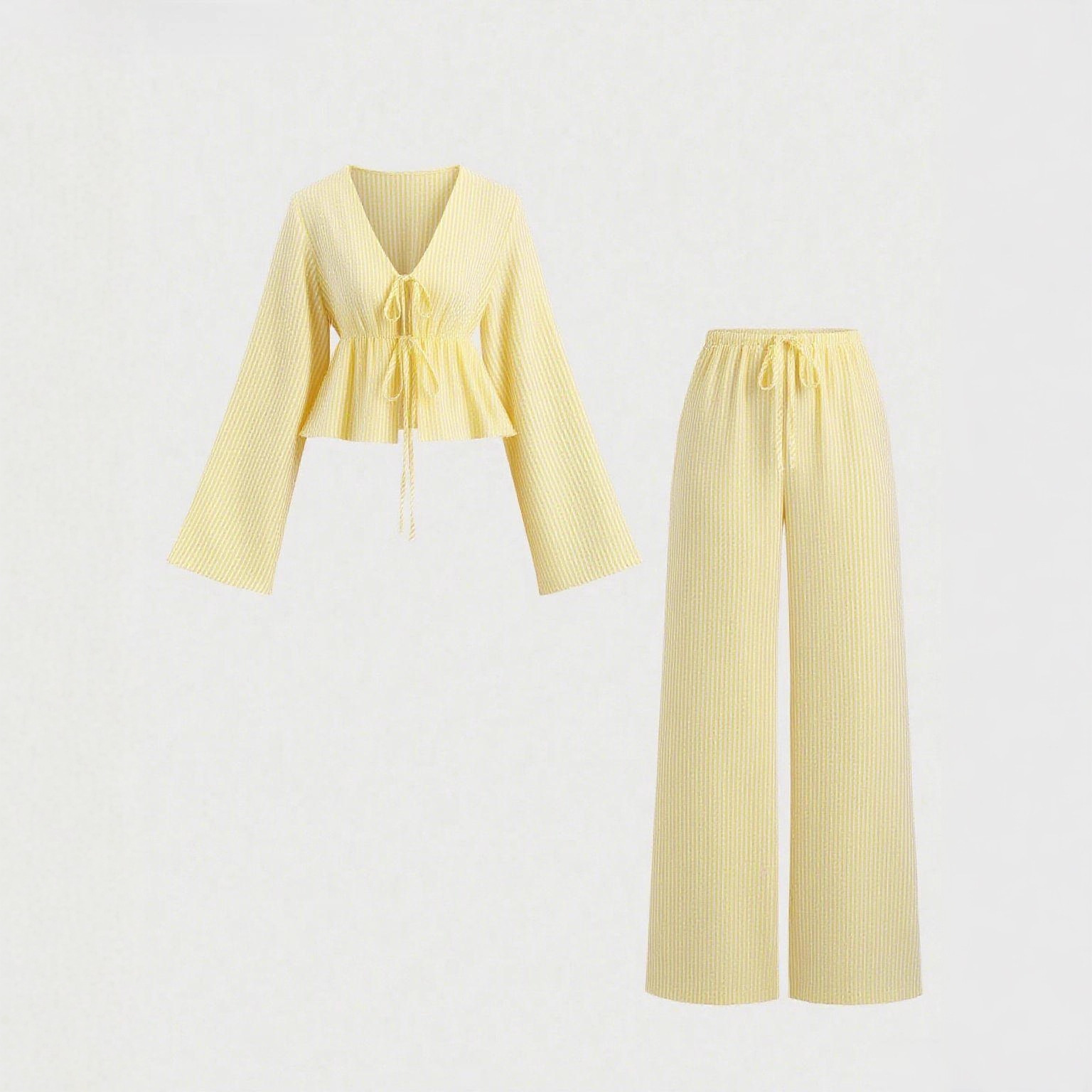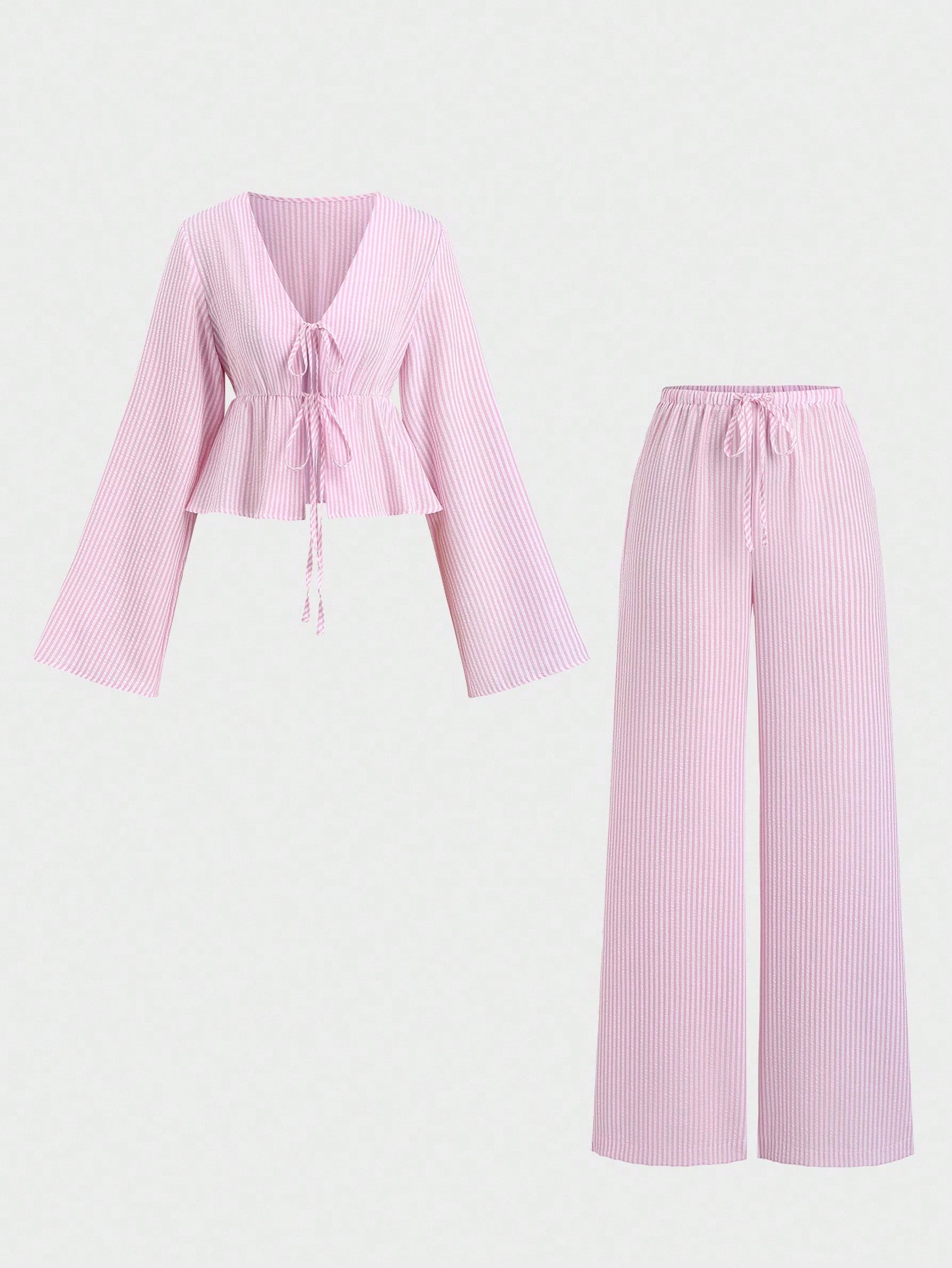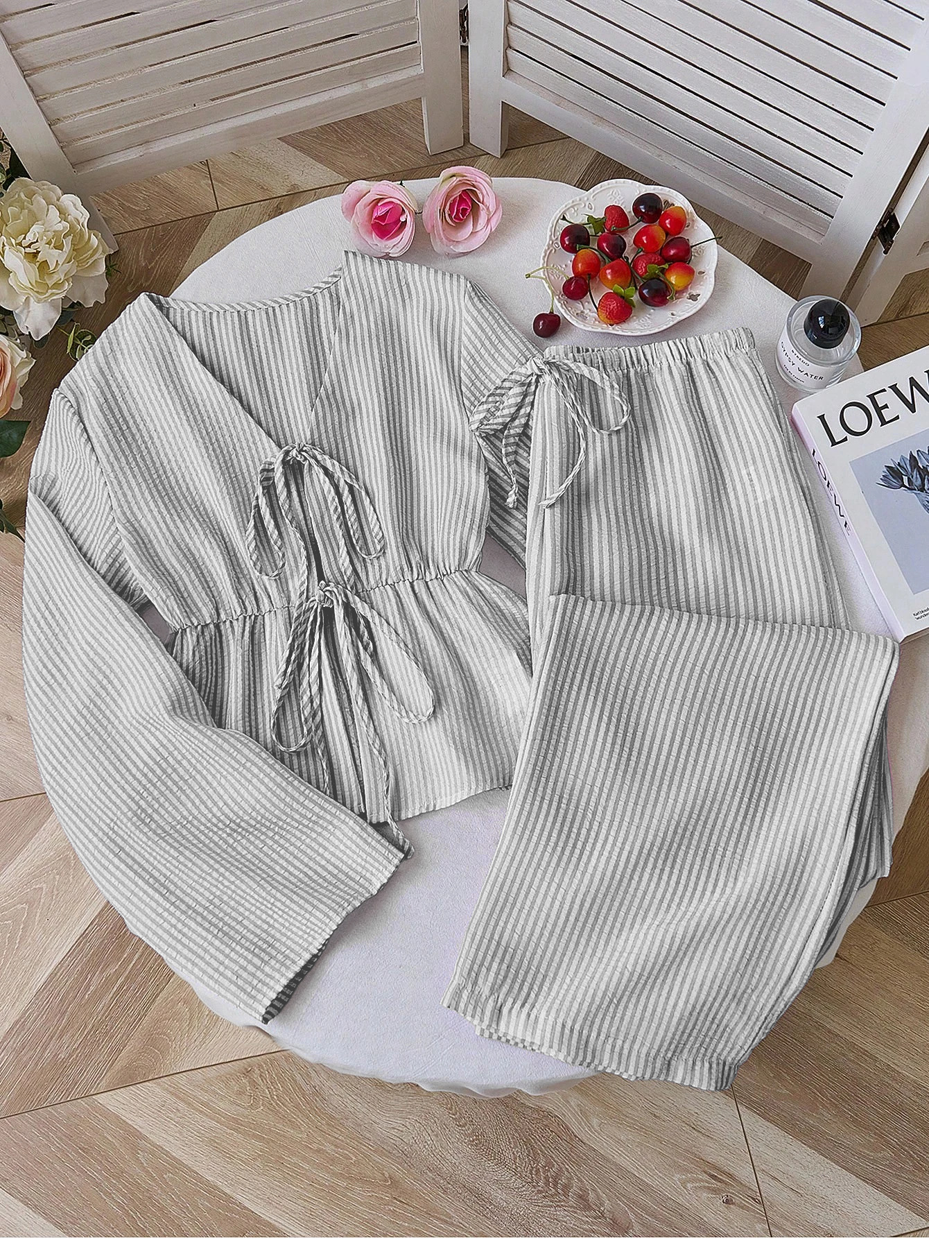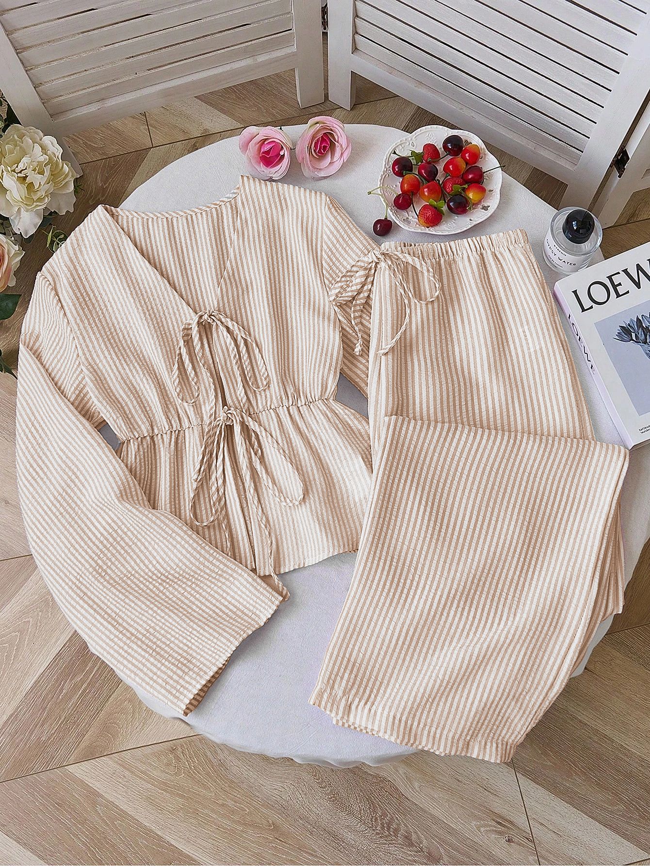 新款舒适高级感条纹宽松系带上衣休闲两件套百搭长袖甜美时尚套装