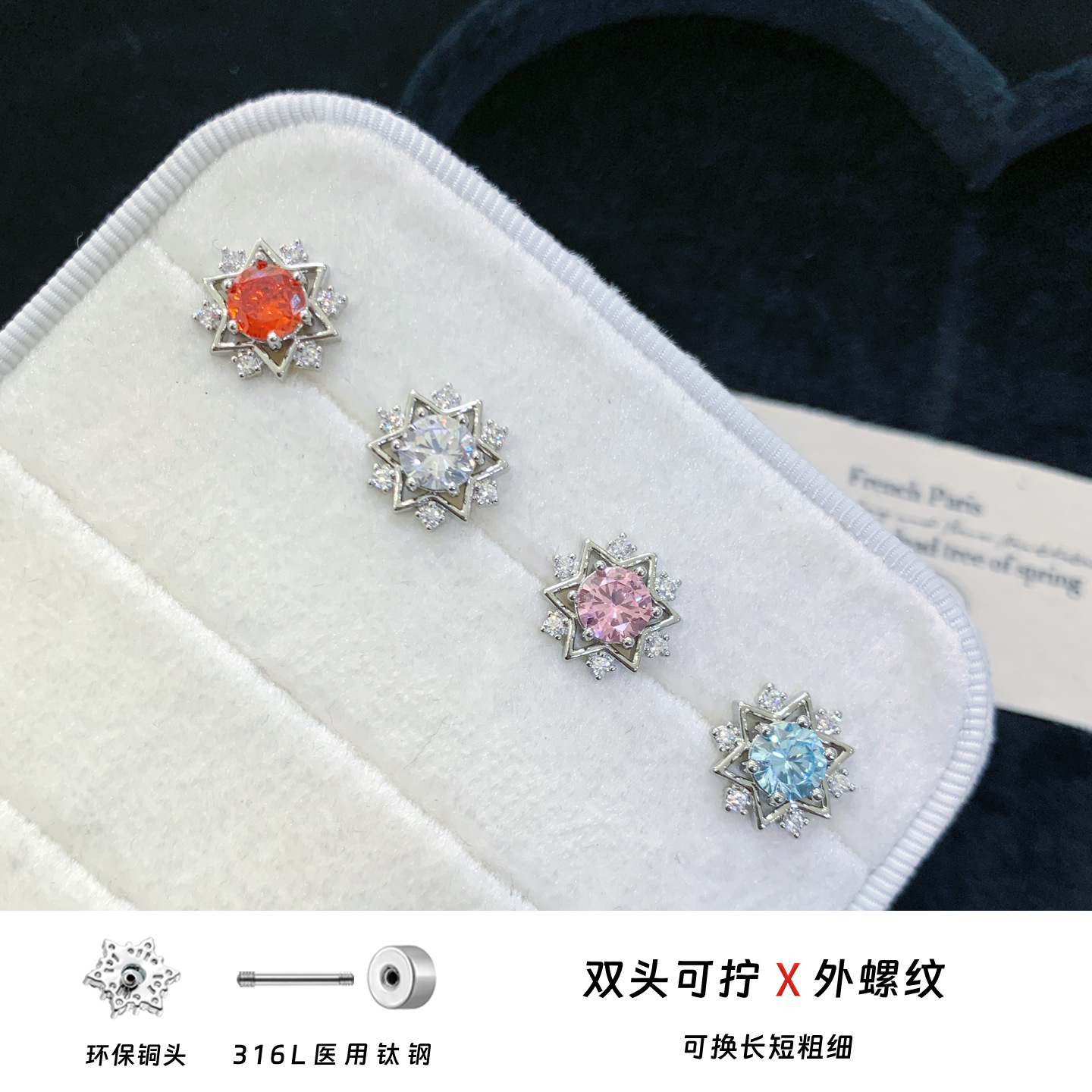316L钛钢耳骨钉雪花外螺纹耳骨钉设计感爆闪锆石耳钉养耳洞耳饰