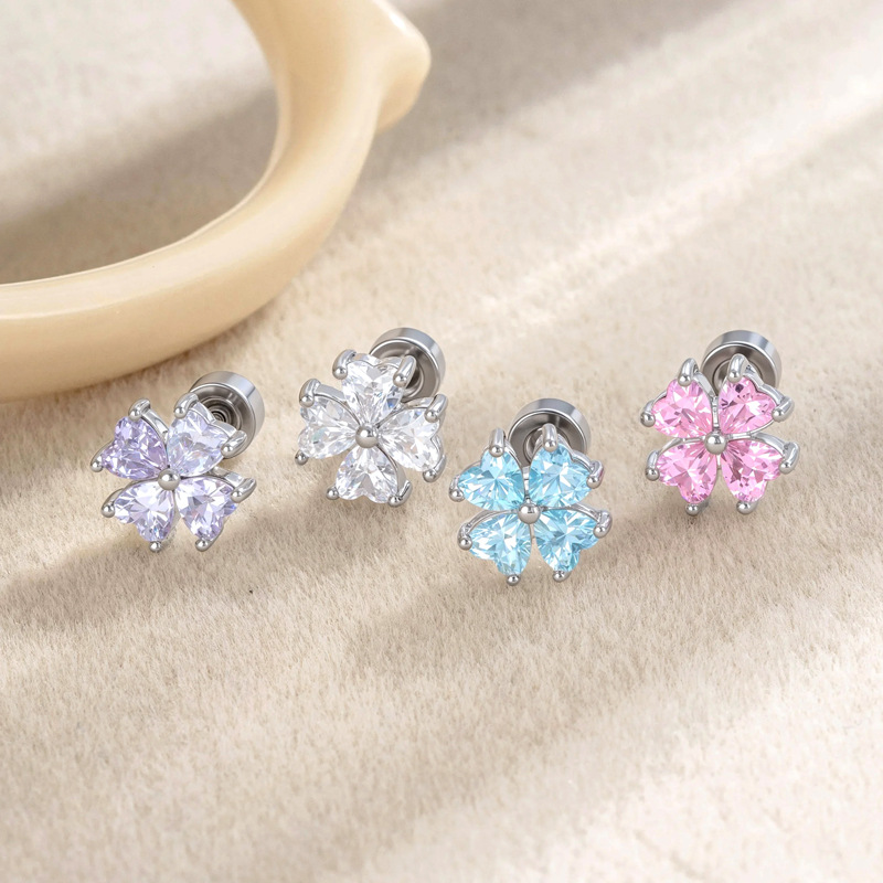 316L医用钛钢耳钉小众高级感爱心四叶草耳骨钉爆闪锆石耳蜗钉