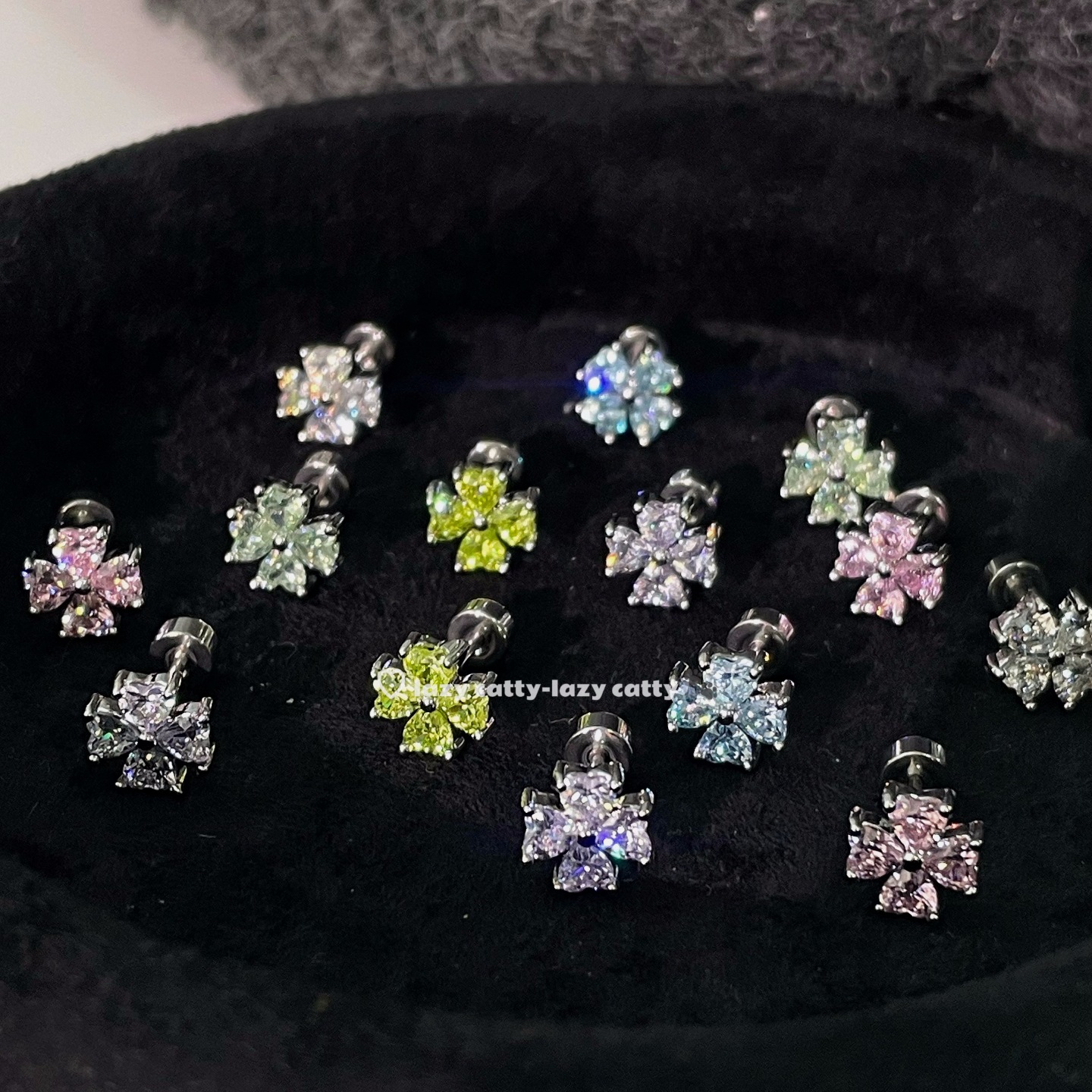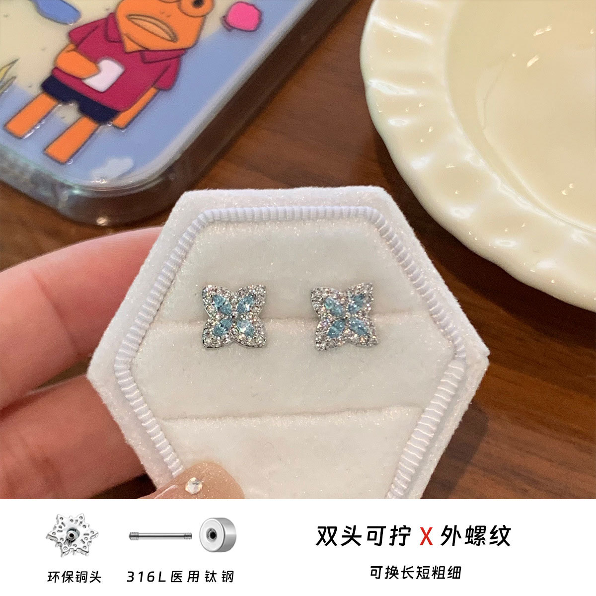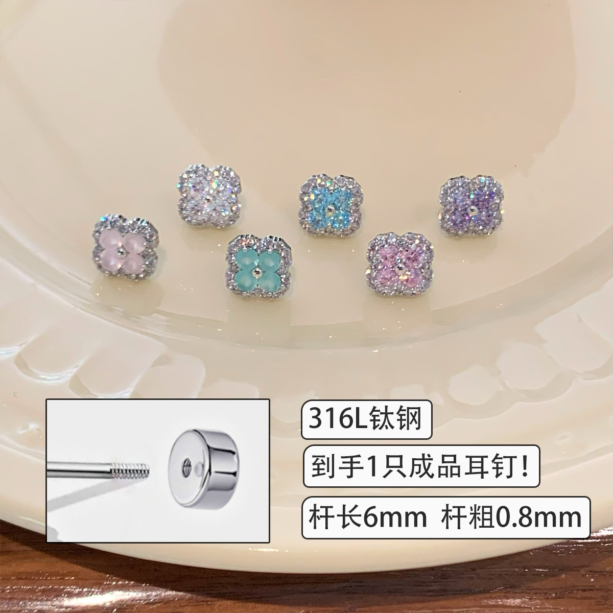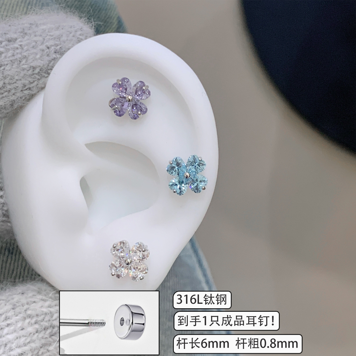 316L医用钛钢耳钉爆闪满钻锆石四叶草耳骨钉轻奢耳蜗钉耳环