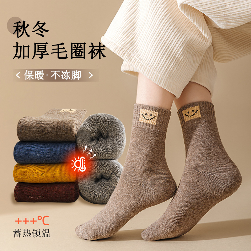 秋冬新款袜子女加厚加绒小笑脸毛圈袜保暖中筒袜地板袜长筒袜女袜
