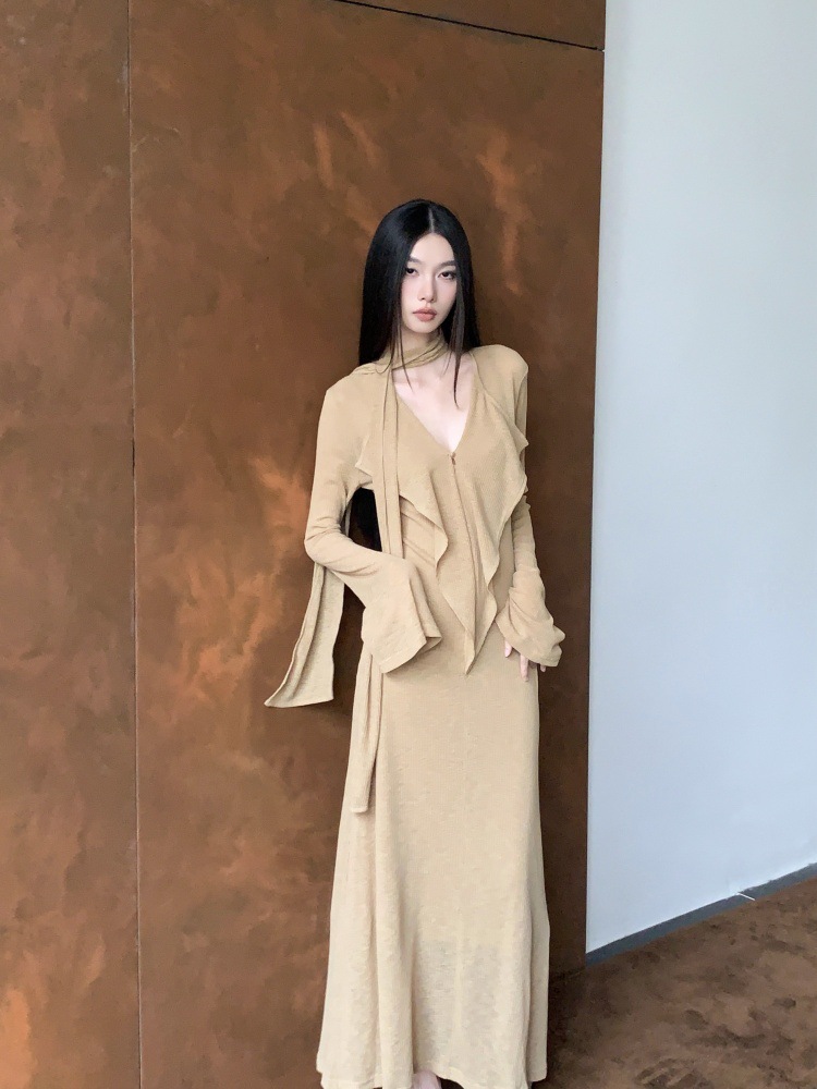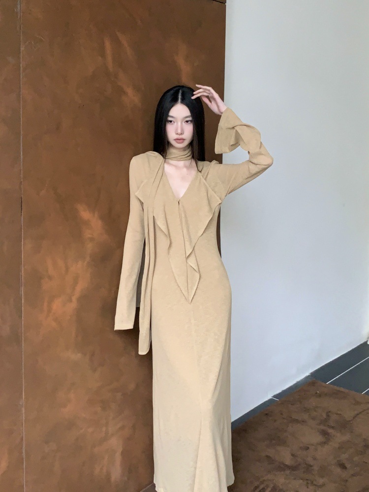 连衣裙女秋设计感小众V领荷叶边长袖飘带修身显瘦气质a字韩系长裙