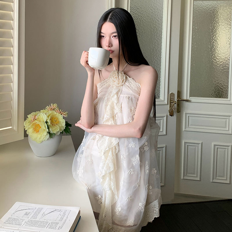女性用ドレス、ニッチな刺繍レースステッチの妖精スカート、ミドル丈のホルターネックふわふわホットガールサスペンダースカート