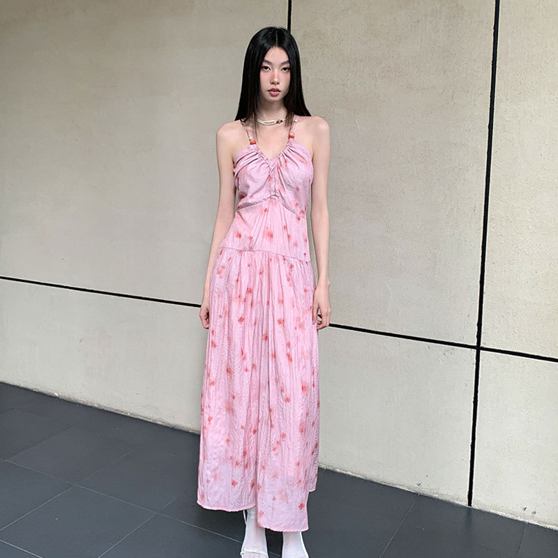 连衣裙女设计感小众油画印花网纱高腰修身显瘦度假气质吊带长裙夏