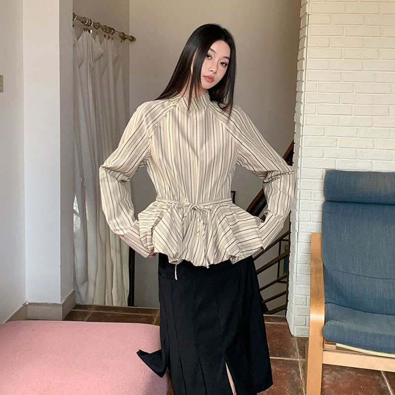 ストライプのシャツの女性の秋のデザイン感の小さい大衆の新しい中国風の立襟の長袖のつぼみのゆったりしている怠惰な年齢の上着