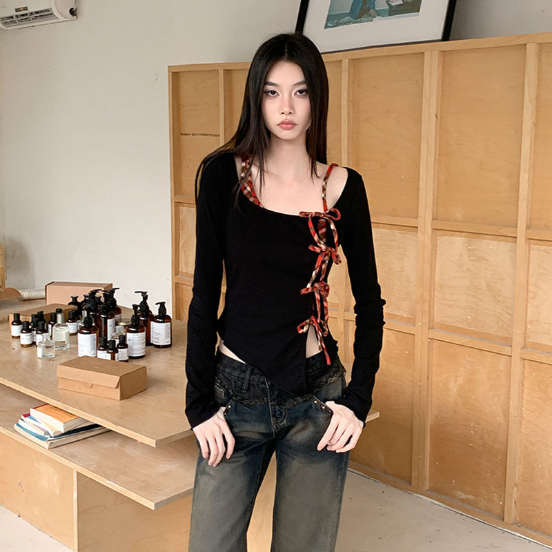 偽の2つのtシャツの女性のデザイン感の小さい大衆の丸首の肩のプルオーバーの長袖の結び目の蝶結びのギャルの修身の上着