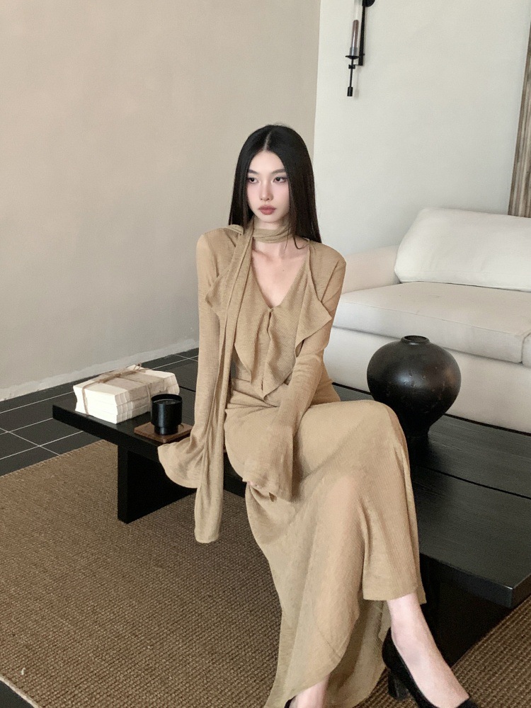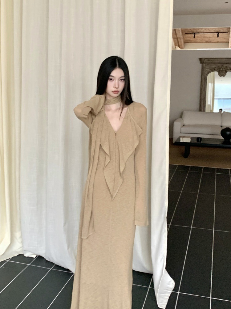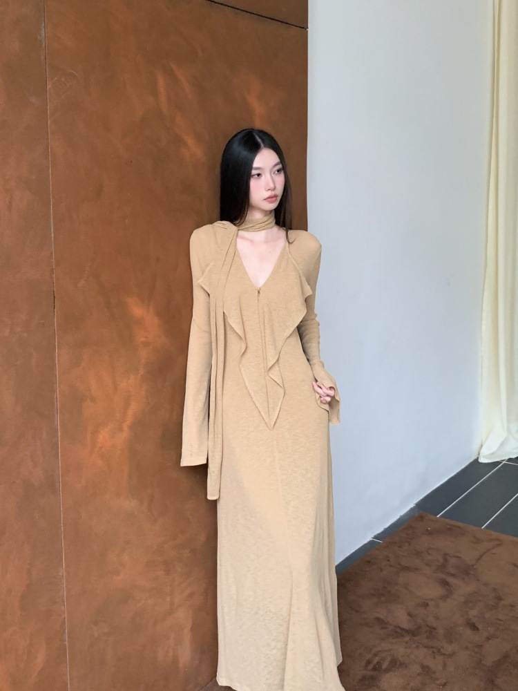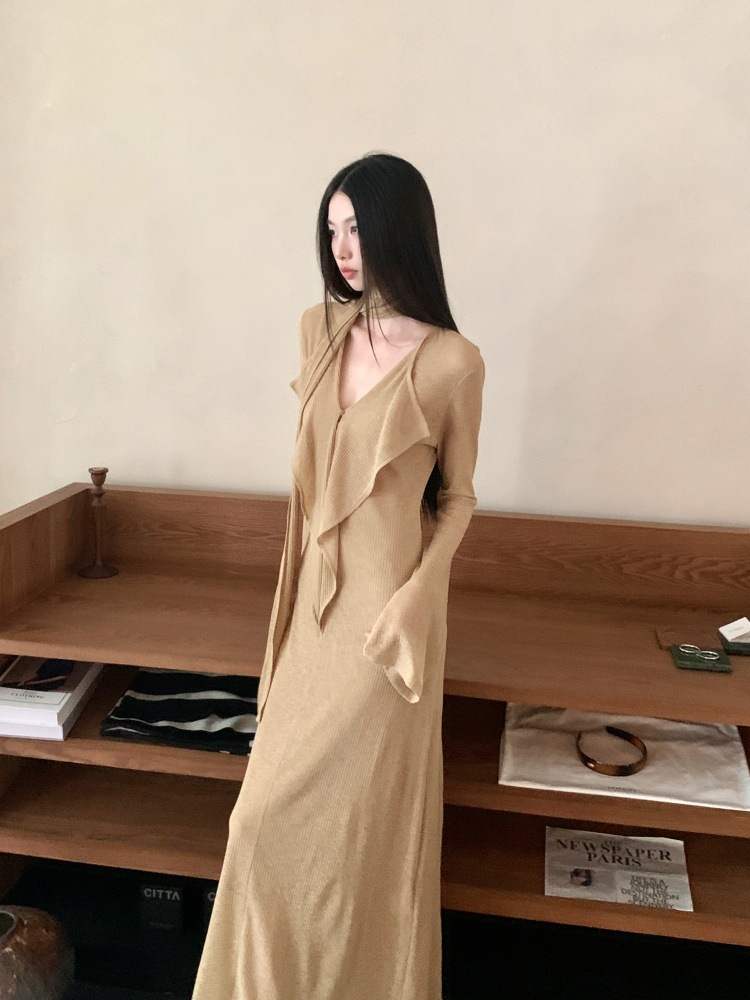 ニットワンピース女性のデザイン感が小さいです。低腰長袖のスリムなロングスカート2024春服です。