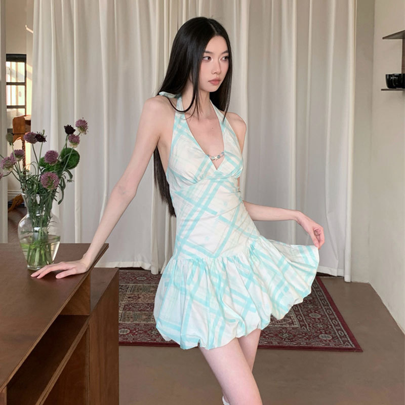 连衣裙女设计感小众薄荷绿V领挂脖短裙海滩度假风收腰花苞蓬蓬裙