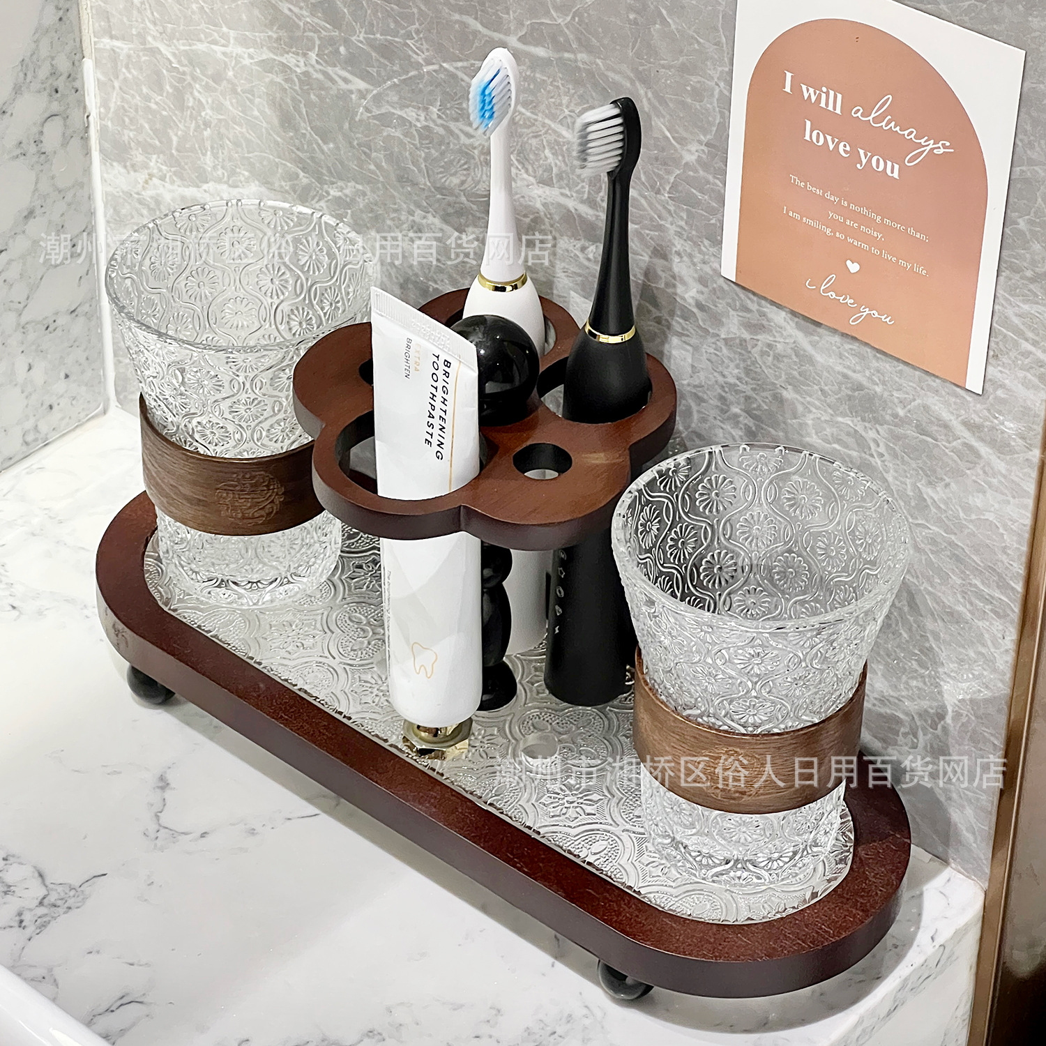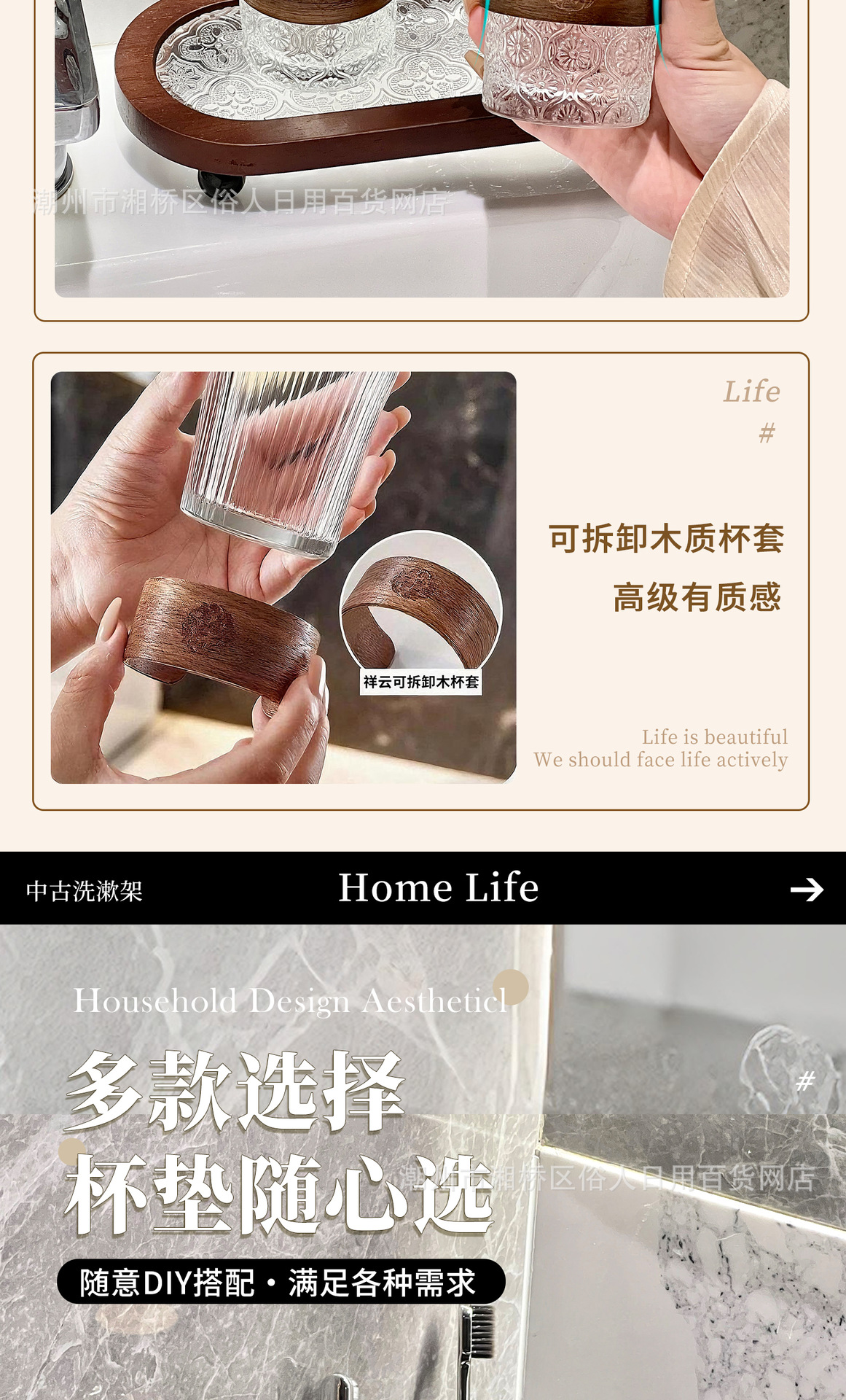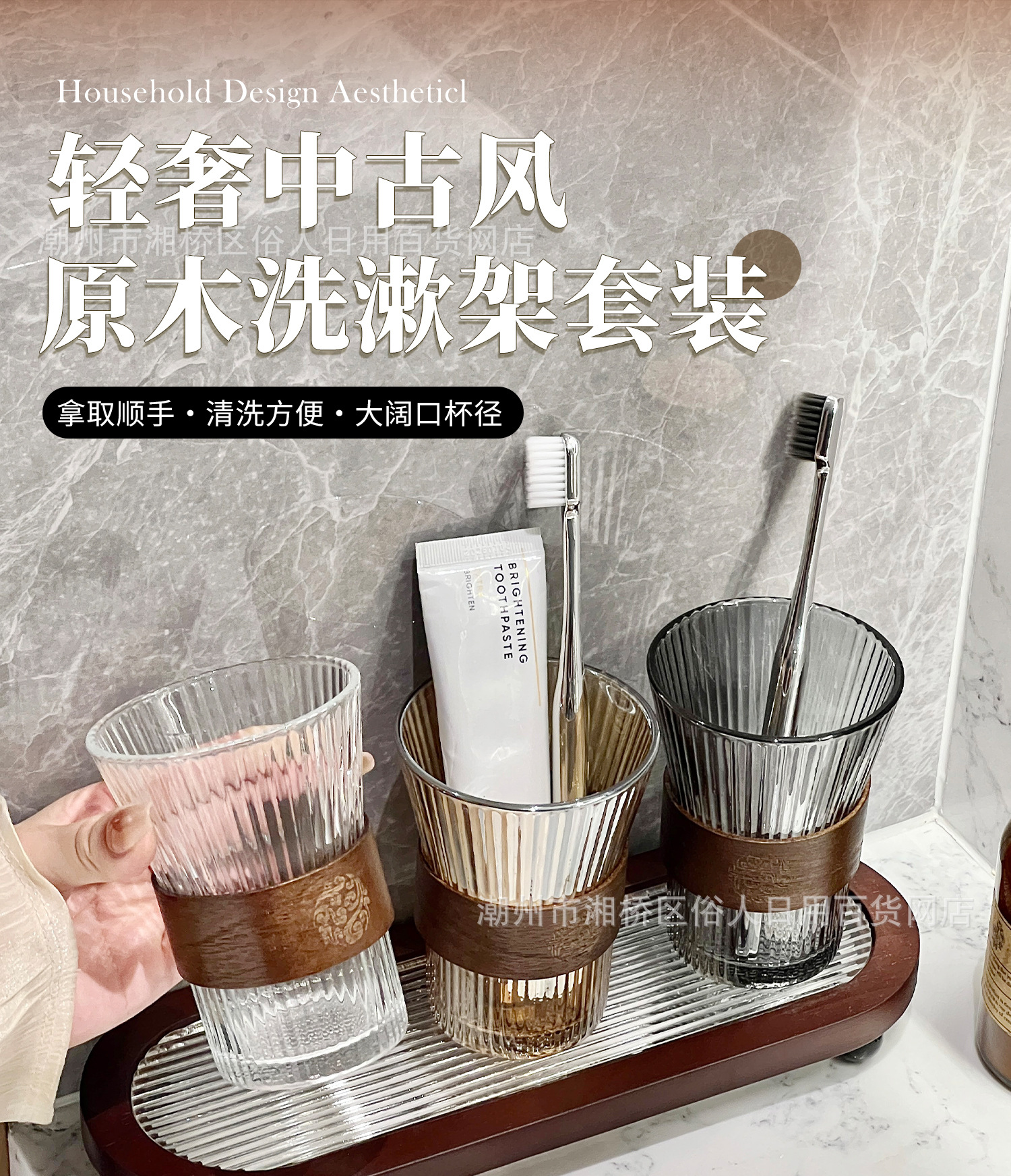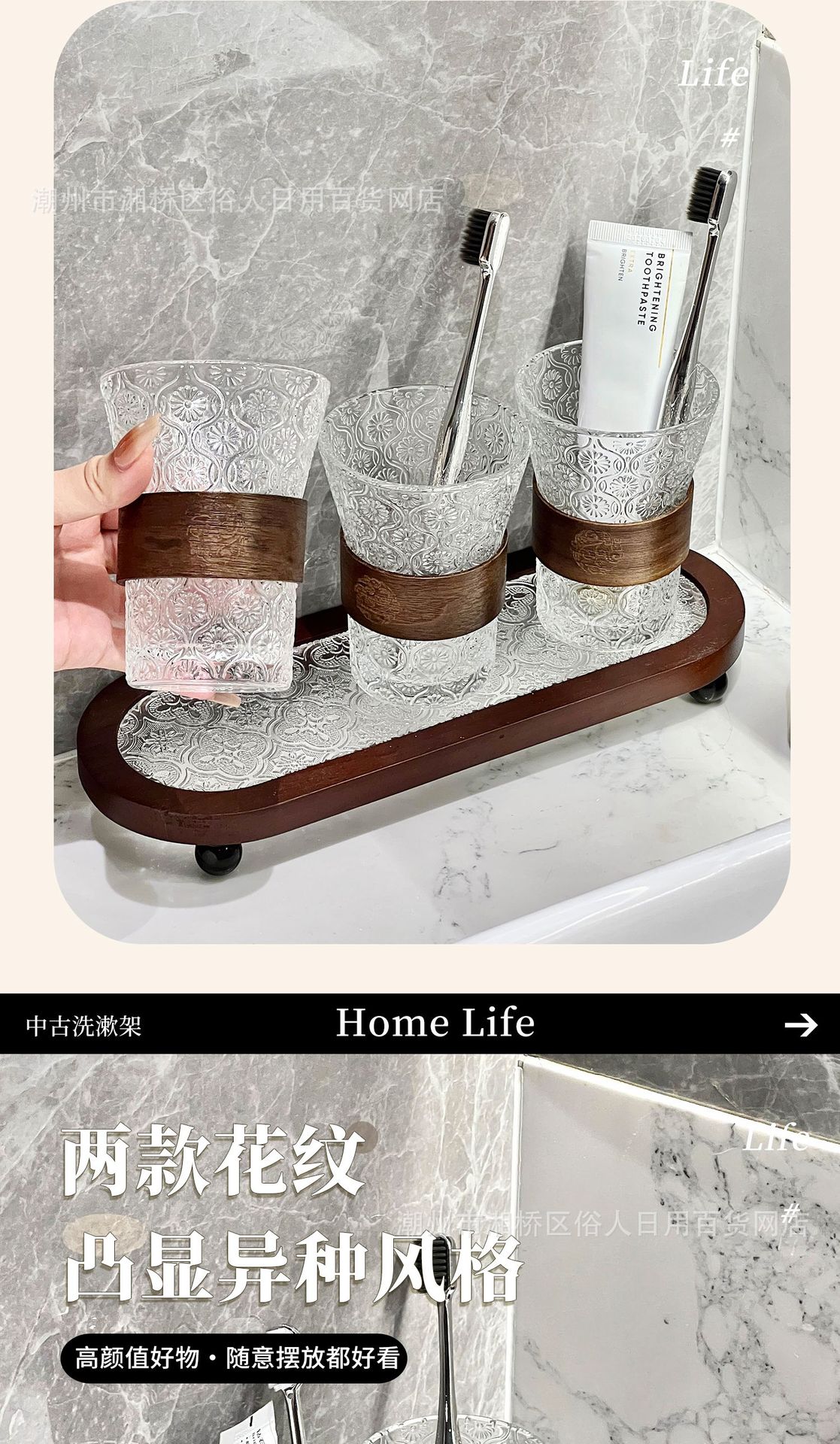 中古风漱口杯套装收纳架高颜值玻璃口杯一体卫生间洗漱台面置物架