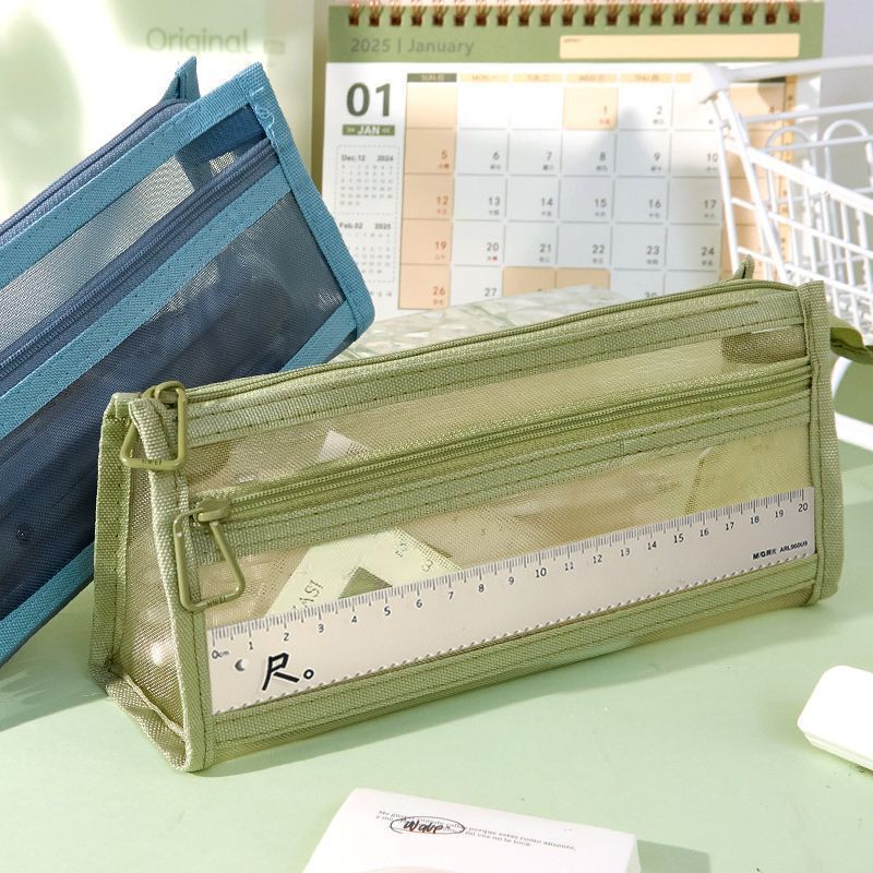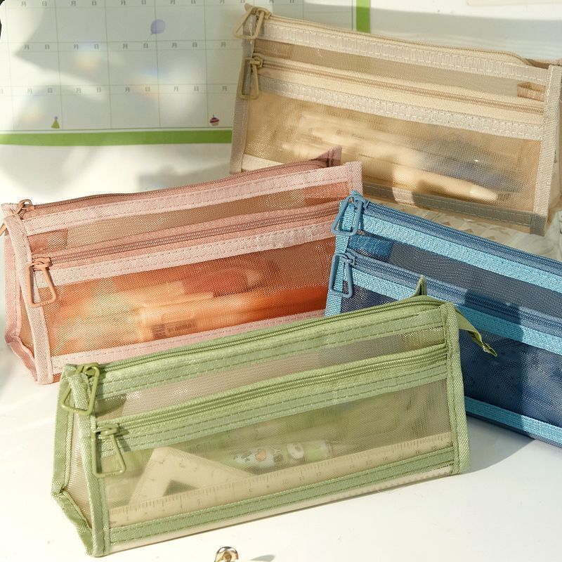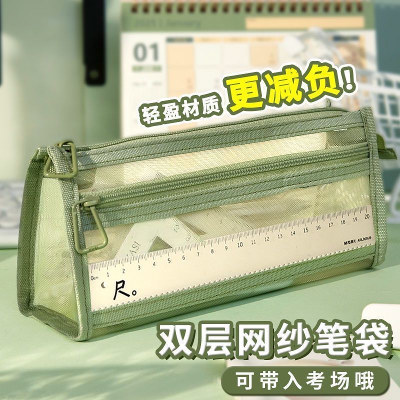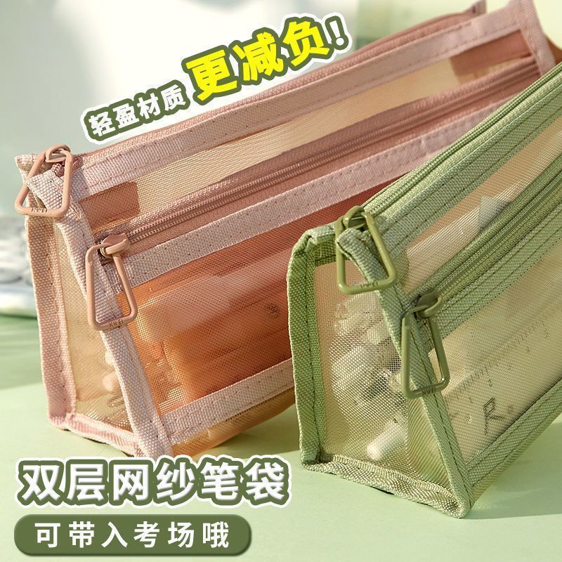 网纱莫兰迪笔袋ins简约透明双层大容量文具学生考试拉链收纳袋