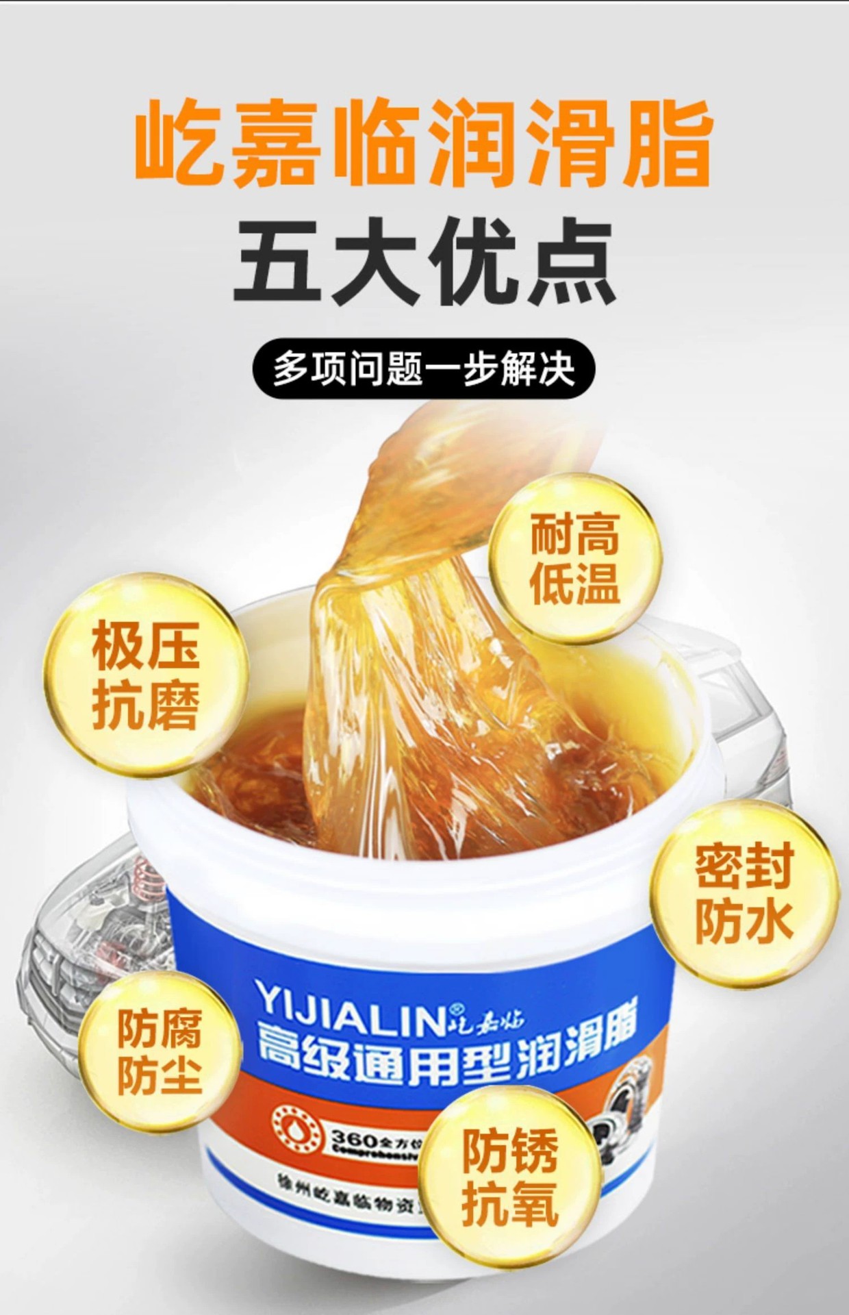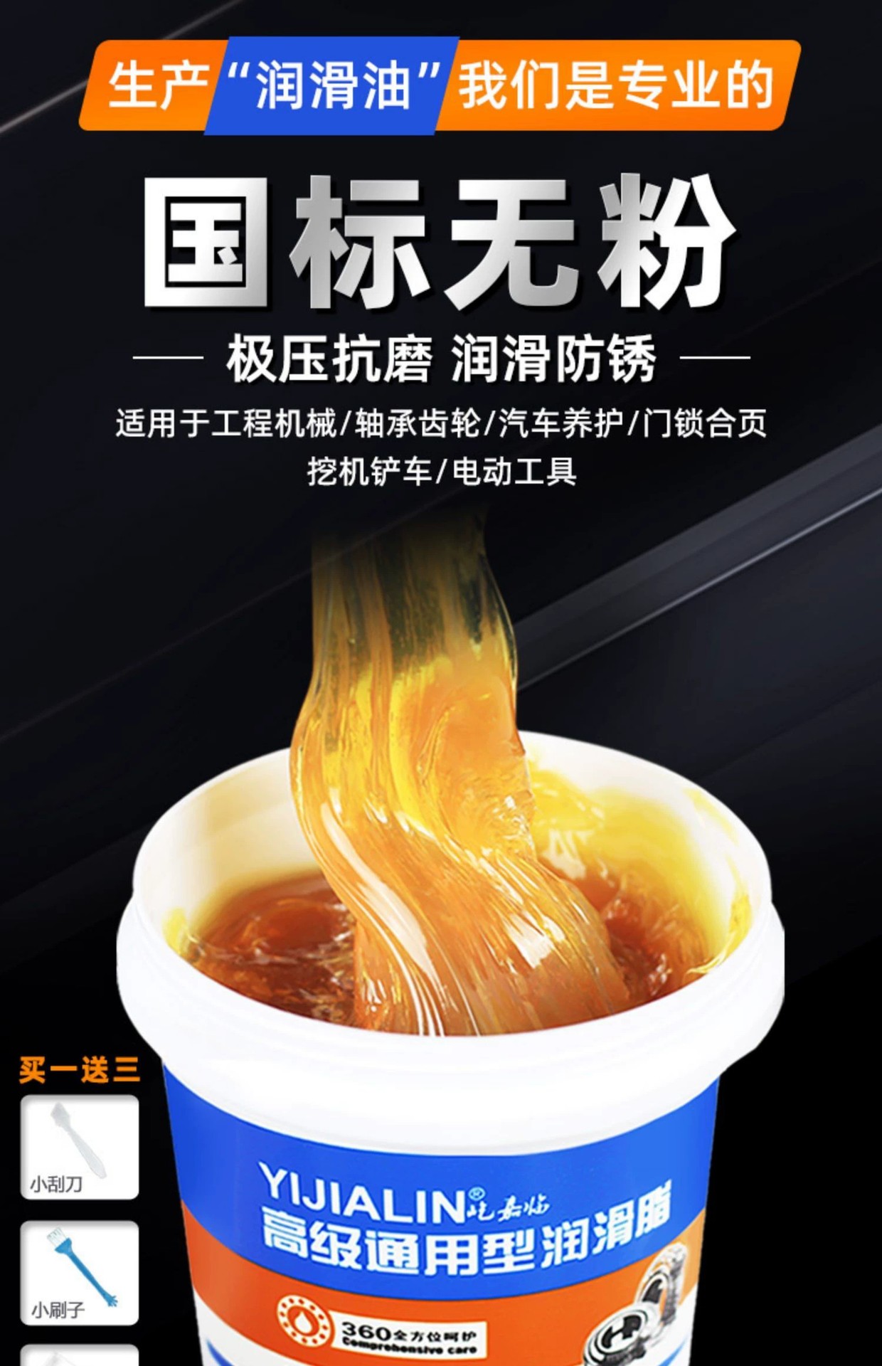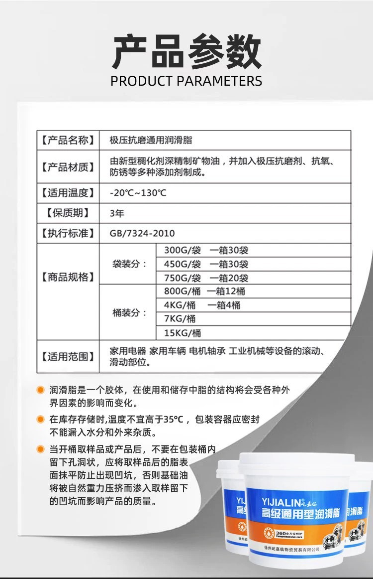 规格 【小罐体验装】300克通用润滑脂,2.5公斤通用润滑脂(黄脂),2.5公斤通用润滑脂(蓝脂),2.5公斤通用润滑脂(黄脂)*2桶,2.5公斤通用润滑脂(蓝脂)*2桶,2.5公斤特级加氢高温润滑脂(蓝脂),500克特级润滑脂黄金脂,500克通用润滑脂(黄脂),500克高级润滑脂(黄脂),500克水设备润滑脂(抗水性强)*1盒,500克防水专用润滑脂(透明色)*1盒,800克润滑脂+便携式单手黄油枪,800克润滑脂+600cc黄油枪,屹嘉临800克高温润滑脂,1公斤特级加氢高温润滑脂(白色),1公斤特级加氢润滑脂(蓝色),2公斤特级加氢高温润滑脂(白色,2公斤特级加氢高温润滑脂(蓝色),4公斤黄油润滑脂(黄脂),屹嘉临4公斤高温油蓝脂特级加氢,7公斤黄油润滑脂(黄脂),屹嘉临7公斤高温油蓝脂特级加氢,120cc单手黄油枪,125ML黄油喷剂,屹嘉临极压抗磨15公斤,屹嘉临15公斤高级通用润滑脂1#,屹嘉临15公斤高级通用润滑脂2#,屹嘉临15公斤高级通用润滑脂3#,屹嘉临15公斤工程机械润滑油1#,屹嘉临15公斤工程机械润滑油2#,屹嘉临15公斤工程机械润滑油3#,特级加氢高温脂-美国1号15公斤-白色,特级加氢高温脂-美国1号15公斤-蓝色