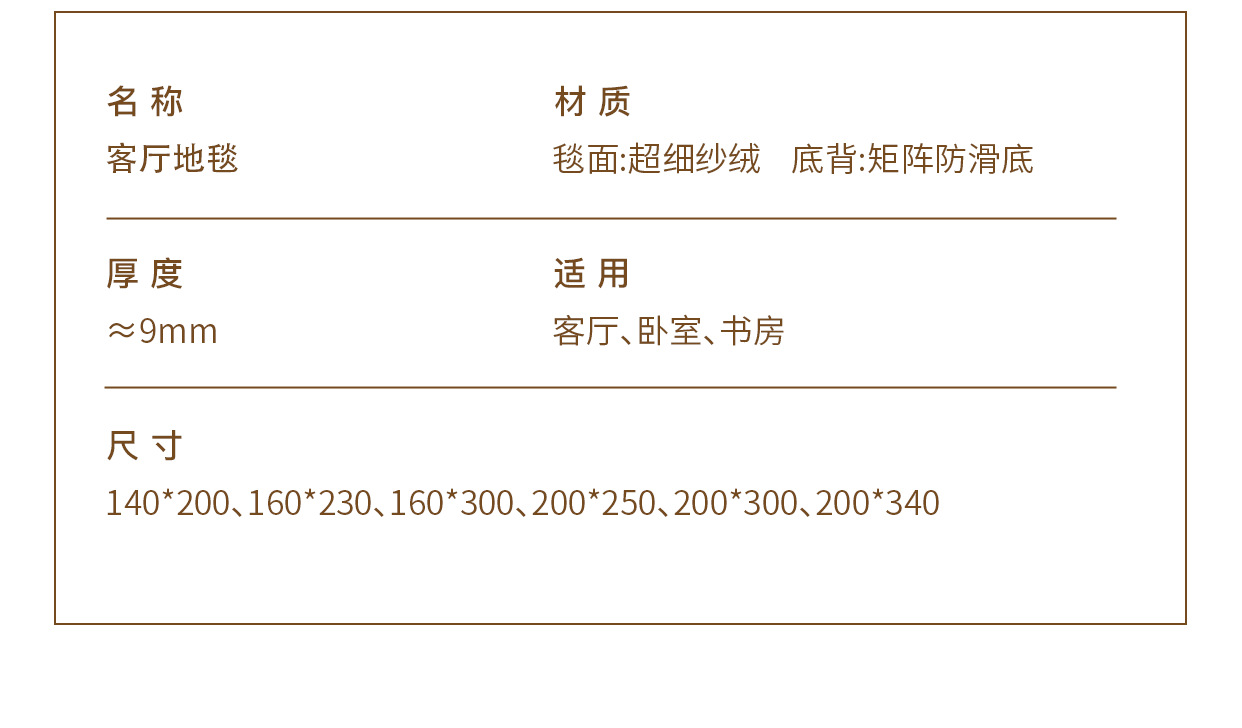200x300cm【热销主推|适合3人或L型沙发】,120x160cm【可上扫地机器人】,140x200cm【适合2-3人小沙发】,160x230cm【凝水毯面-易清洁】,160x300cm【打理无忧|床尾推荐尺寸】,200x250cm【适合中小户型客厅】,200x340cm【适合3人或L型沙发】,240x360cm【提升幸福面积|适合4人或L型沙发】,240x400cm【提升幸福面积|适合4人或L型沙发】,300x400cm【适合超大客厅】,【更多尺寸款式|定制咨询客服】